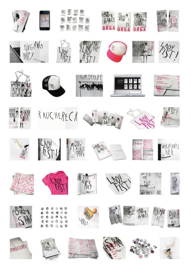 identity was created as a diploma thesis with the aim of both making the festival accessible to a wider public and transporting the political content of the event beyond its hitherto subculture confines. Using a stop motion technique, several typical Ladyfest slogans and statements were illustrated typographically and animated as web clips, while some of the still images were used in various media, such as in the programme brochure, in print ads and for various merchandise items. The result is a consistent appearance that indicates the distinct and creative programme of the Ladyfest. The recurring hand-written typography represents a prominent element of the overall corporate design.