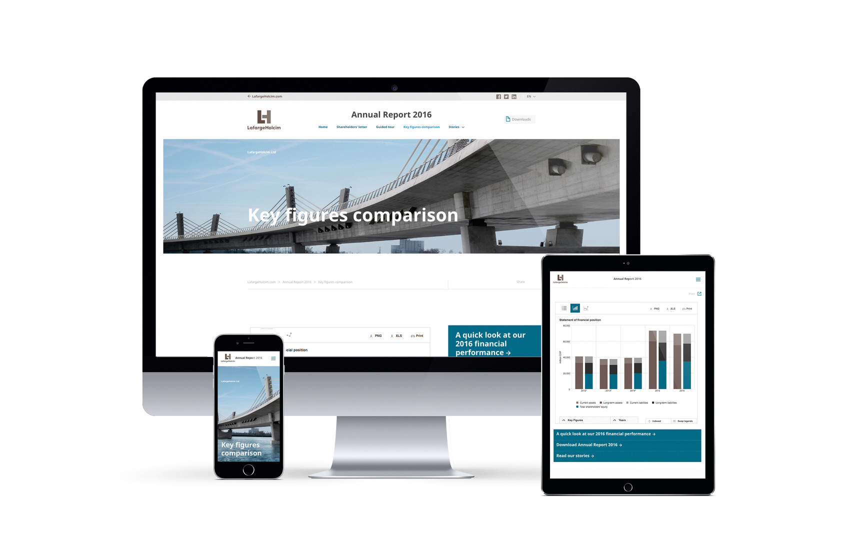 The annual report of LafargeHolcim, which was optimised for desktop and tablet, comprises both integrated storytelling and the Guided Tour reporting format. This newly developed reporting format presents the most important data of the fiscal year with the option of interactively correlating and commenting on numbers and facts. With the help of integrated storytelling, the implementation of the company strategy, which was designed the previous year, becomes accessible to the reader on an emotional level. Large portraits and videos alternate with photo series and corresponding texts.