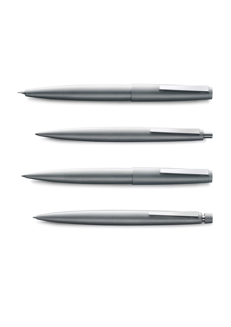 Lamy 2000 fasziniert durch die nahtlose strichmattierte Oberfläche und den ansatzlosen Übergang der Produktsegmente. Alle sichtbaren Komponenten sind massiv aus Edelstahl gefertigt. Aus der Kombination von Design, Material und Oberflächenstruktur ergibt sich eine erhabene Eleganz und ein ausbalanciertes Gewicht, das angenehmes Schreiben ermöglicht. Charakteristische, kontrastierende Details wie einzelne Fasen und tiefer liegende Oberflächen wurden poliert. Der Clip ist jeweils fremdgefedert und der Cliprücken hochglanzpoliert. Der Füllhalter wurde mit Goldfeder und Kolbenmechanik ausgestattet, der Kugelschreiber mit der gewohnten Druckmechanik, und der Tintenroller ist wie der Füllhalter als Kappenmodell ausgeführt. Der Druckbleistift besitzt eine Druckmechanik mit Radiertip und schreibt mit Bleiminen der Strichstärke 0,7 mm.