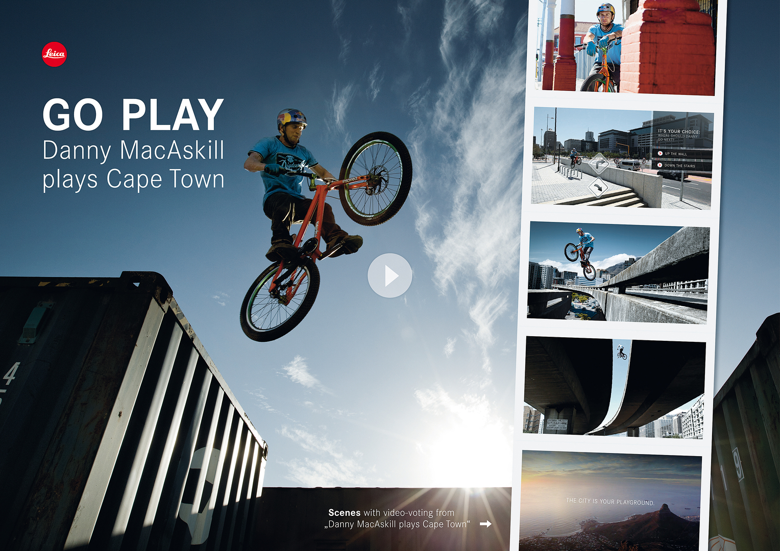 The lightness of taking photographs with the Leica V-Lux 30 camera is visualised in film by accompanying “Go Play” Danny MacAskill, one of the best street-trial bikers, through Cape Town. Just like young photographers discovering a city through pictures, MacAskill can easily turn a city into a playground for his enormous skill and artistry. In this case, Internet users could interactively choose between three teaser videos and thus decide which thrilling stunts they wanted Danny MacAskill to dare. The resulting “users’ cut” achieved more than 520,000 views on YouTube and 2,900 “likes” within six months.