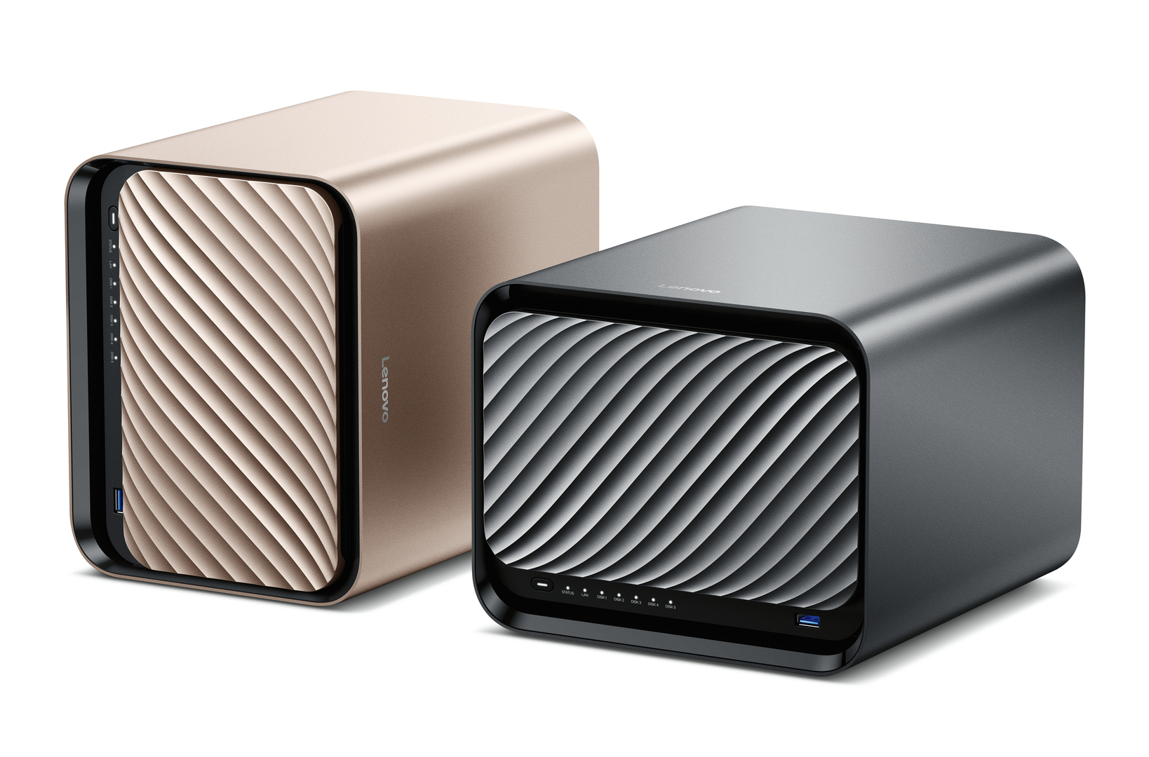 Die Lenovo-NAS-V1/X1-Serie umfasst zwei Modelle mit unterschiedlicher Farbgebung, die auf kleine Büro- und Heimumgebungen ausgerichtet sind. Der NAS-Speicher verfügt über fünf Laufwerke und bietet Speicherplatz für Datennetzwerke und Dateiverwaltung für kleine Teams und professionelle Anwender. Das nahtlos gestaltete Gehäuse besteht aus extrudiertem Aluminium, das eine hohe Steifigkeit besitzt und Wärme effizient ableitet. Die wellenförmigen Kühllamellen an der Vorderseite verleihen dem Gerät eine freundliche Anmutung.