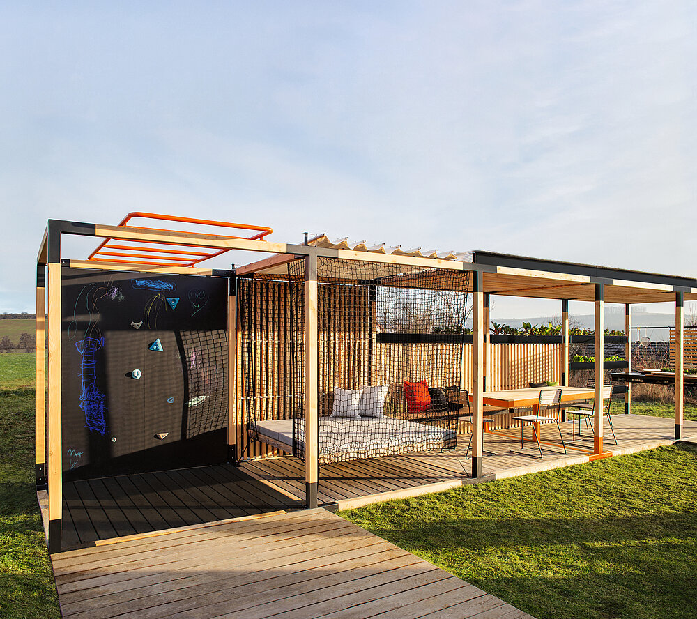 Das modulare Bausystem Leva wurde entworfen, um den Aufenthalt im Freien möglichst komfortabel zu gestalten. Seine kubische Grundstruktur gibt einen Rahmen vor, in den maßgeschneidertes Zubehör eingebaut wird. Es stehen diverse Module zur Auswahl wie z. B. ein hängendes Bettgestell oder textile Schattendächer. Drei Produktlinien erfüllen unterschiedliche Bedürfnisse: Leva home ist für private Gärten und Terrassen gedacht, Leva public für Parks, Radwege oder Rastplätze und Leva office als Outdoor-Arbeitsbereich.