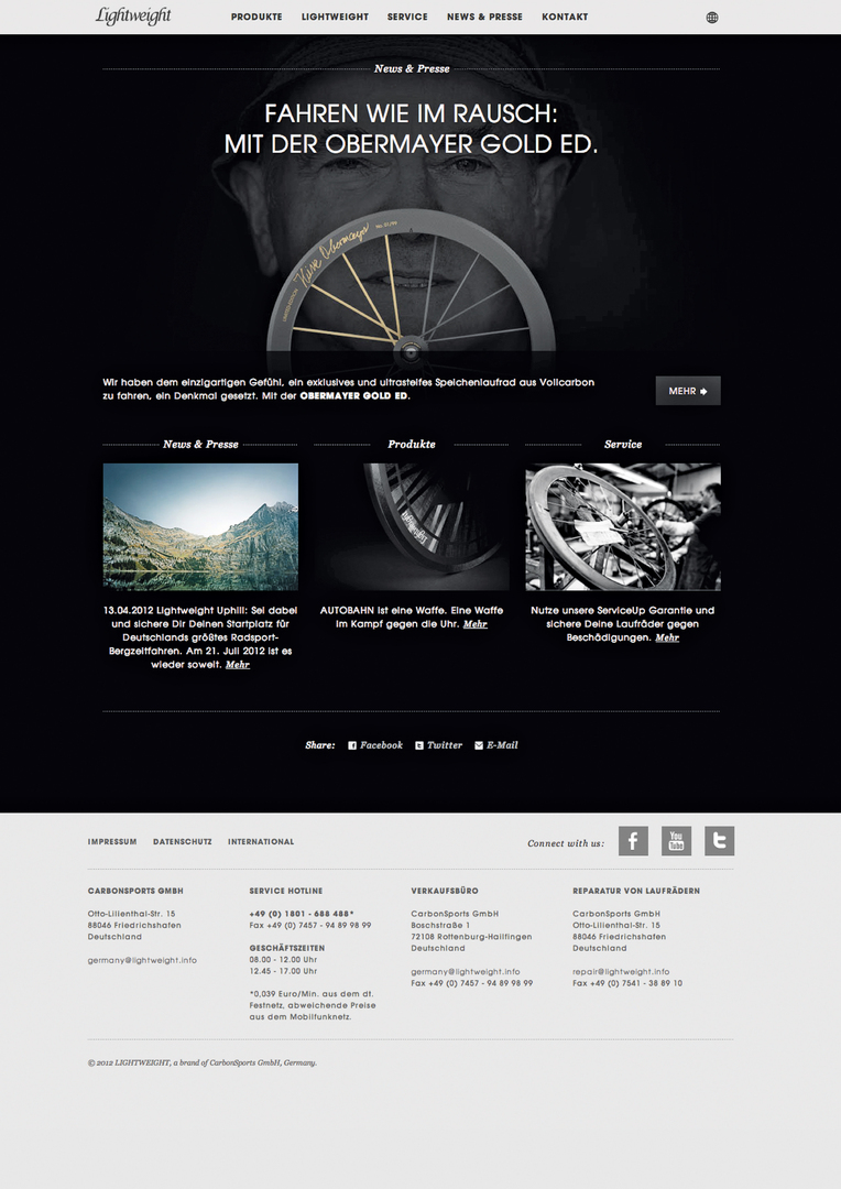 The minimalist product philosophy of a German manufacturer by the name of Lightweight is reflected by the company website. Visualised through the creative concept and presented via expressive black-and-white photography is the perfect nature of the products. Emotive videos are juxtaposed with real racing shots, which are interwoven with technical details and surprising animations, just like the carbon fibres of every wheel. The website offers its target audience a wealth of information, ranging from sponsoring right through to the pick-up service and the company’s history.