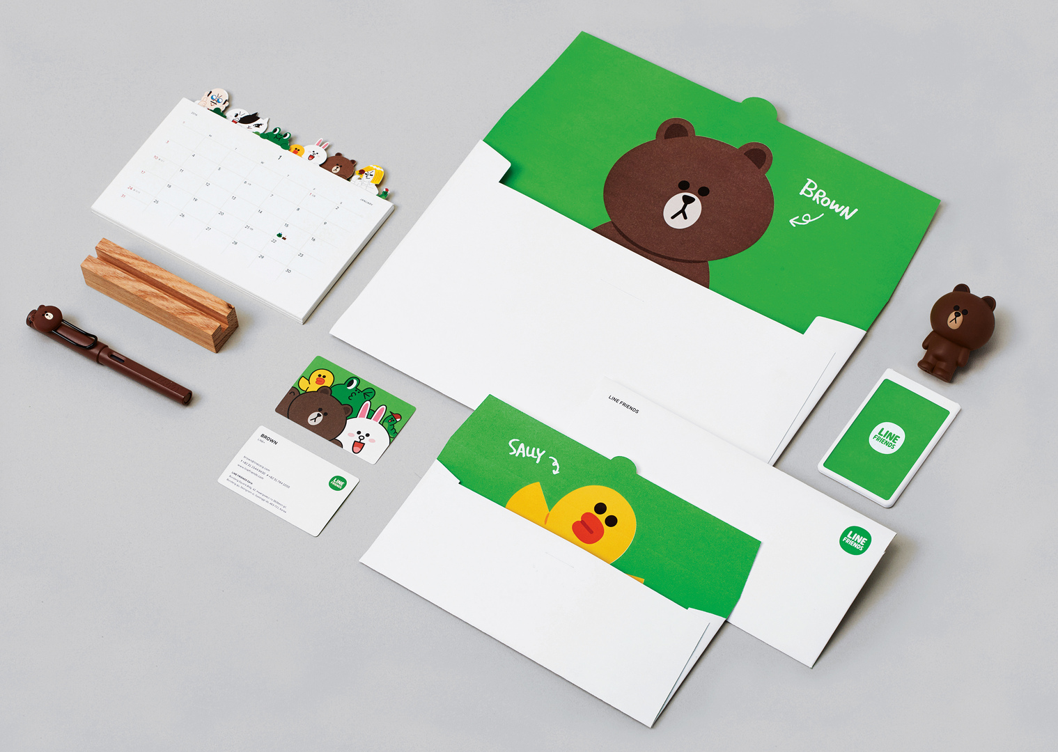 Starting as Character Emoticon for a mobile messaging app, Line Friends became an independent company. In order to further establish its professional image, a new corporate identity was developed. By utilising basic logos, colours, fonts and hundreds of source characters made for emoticons, possibilities for expression and expansion have been left open as much as possible. From business cards, employee ID cards and signage to interior design, everything was created to display the wit and individuality of the company‘s identity. The nine different types of business cards create a friendly atmosphere.