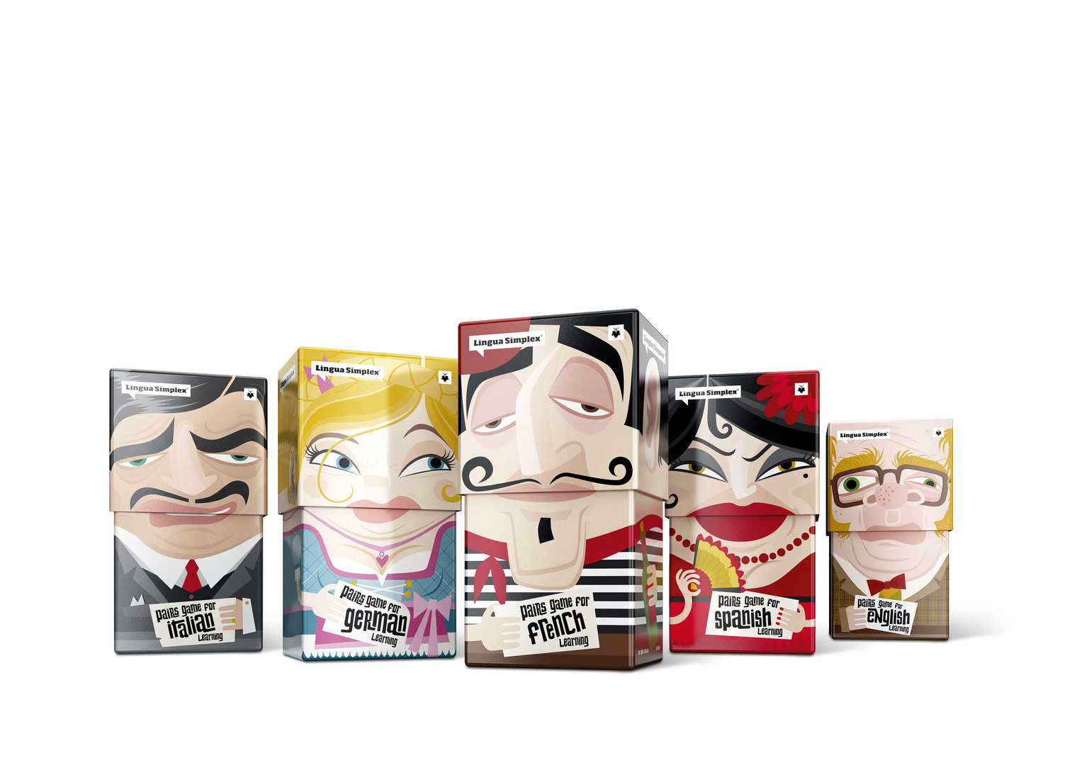 The packaging of Lingua Simplex sketches national characters in a brilliant manner through highly expressive illustrations. The analogy of opening the mouth is an aspect that adds excitement and fun, because mispronouncing a word in a foreign language inevitably makes people laugh. Overall, this is an appealing, humorous and highly convincing concept that invites players to learn a new language.