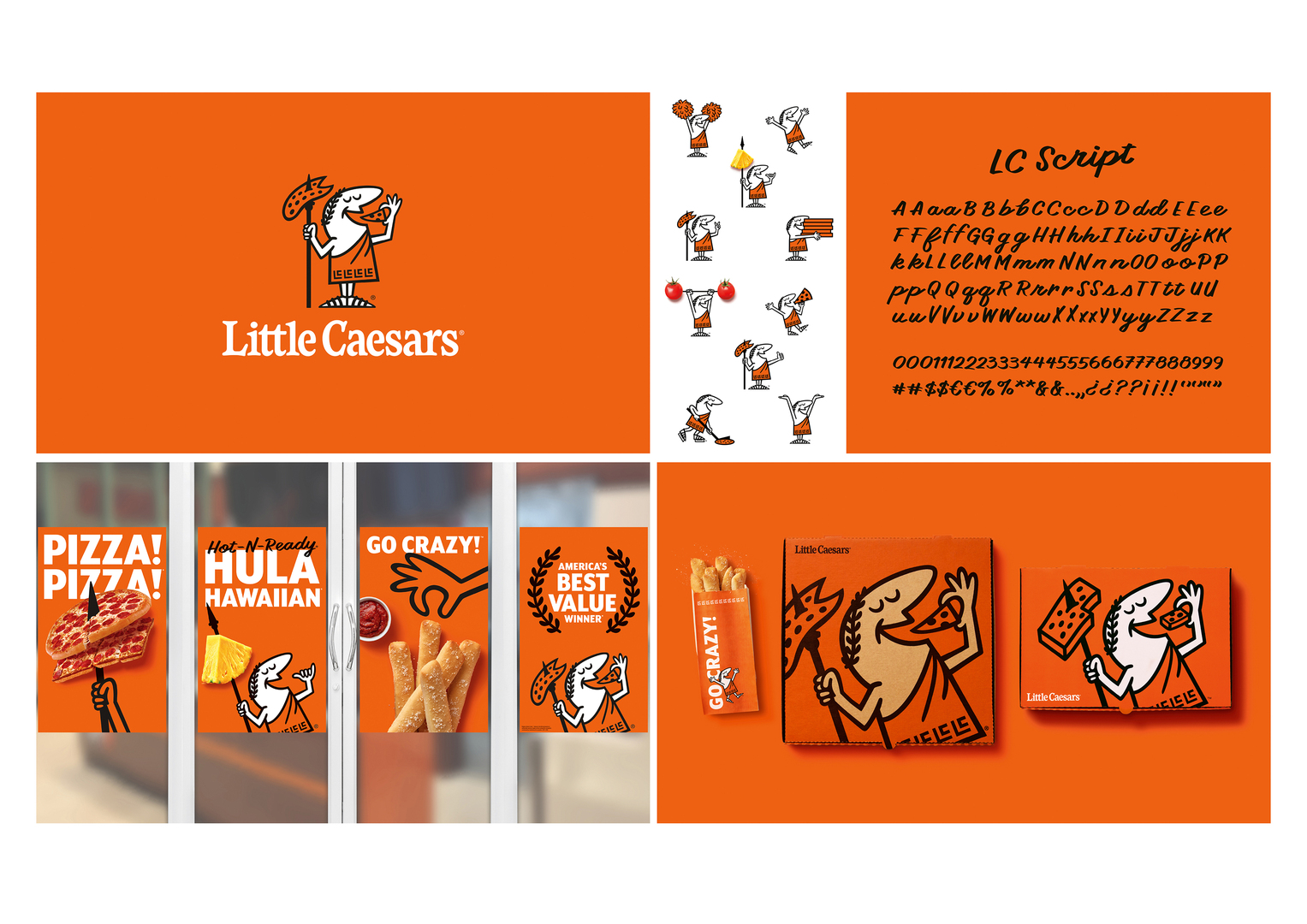The brand design of Little Caesars was relaunched with the goal of giving the fast food chain greater clarity and consistency while staying true to its roots and key messages. Firstly, the word mark was refined for better legibility across contexts. Secondly, the beloved classic Caesar character was redesigned, amplifying his personality through an array of new poses, props and animations. Last but not least, a custom typeface was crafted to infuse even more character into communications. The use of the brand’s distinctive orange colour palette and the new approach to food photography shape the visual identity.