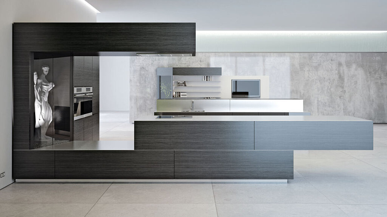 Passend zum Ambiente eines Loft-Wohnraums bietet diese Küche Schrankmodule, die sich für die Auslage dekorativer Gegenstände besonders eignen. Die Küche Loft basiert auf einem stringenten Gestaltungskonzept, das den Einsatz hochwertiger Materialien wie Karbon, rostfreiem Stahl, Furnier und Glas bevorzugt. Ihre prägnante Kontur wird von einer segmentartigen Bauweise bestimmt, wobei die geometrischen Proportionen die Wirkung der Schrankelemente betonen. Die Kücheninsel umfasst einen verborgenen, zweiseitig zugänglichen Schrank mit einem elektromechanischen Antrieb zum automatischen Öffnen.