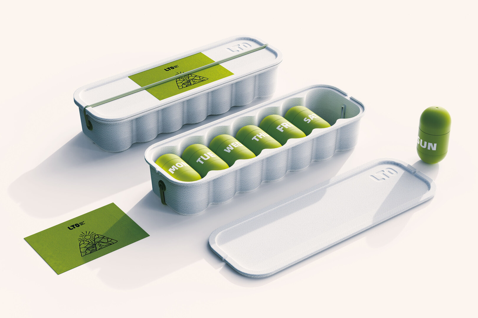 LTO pill-shaped instant coffee capsules are compact and cute. Arranged as a pack of seven in an eco-friendly outer case, consumers can enjoy instant coffee on the go seven days a week. Each instant coffee capsule is made of PP and contains 2g of freeze-dried coffee powder, which is protected by airtight aluminium foil. The eco packaging, which is made of recycled newspaper and 50% bagasse pulp, is structurally designed to withstand daily use. A stylish colour-coded bungee cord holds the lid in place. The packaging is designed such that after the coffees are consumed, users can use it as a pencil case, or simply bury it in the soil and allow it to decompose naturally.
