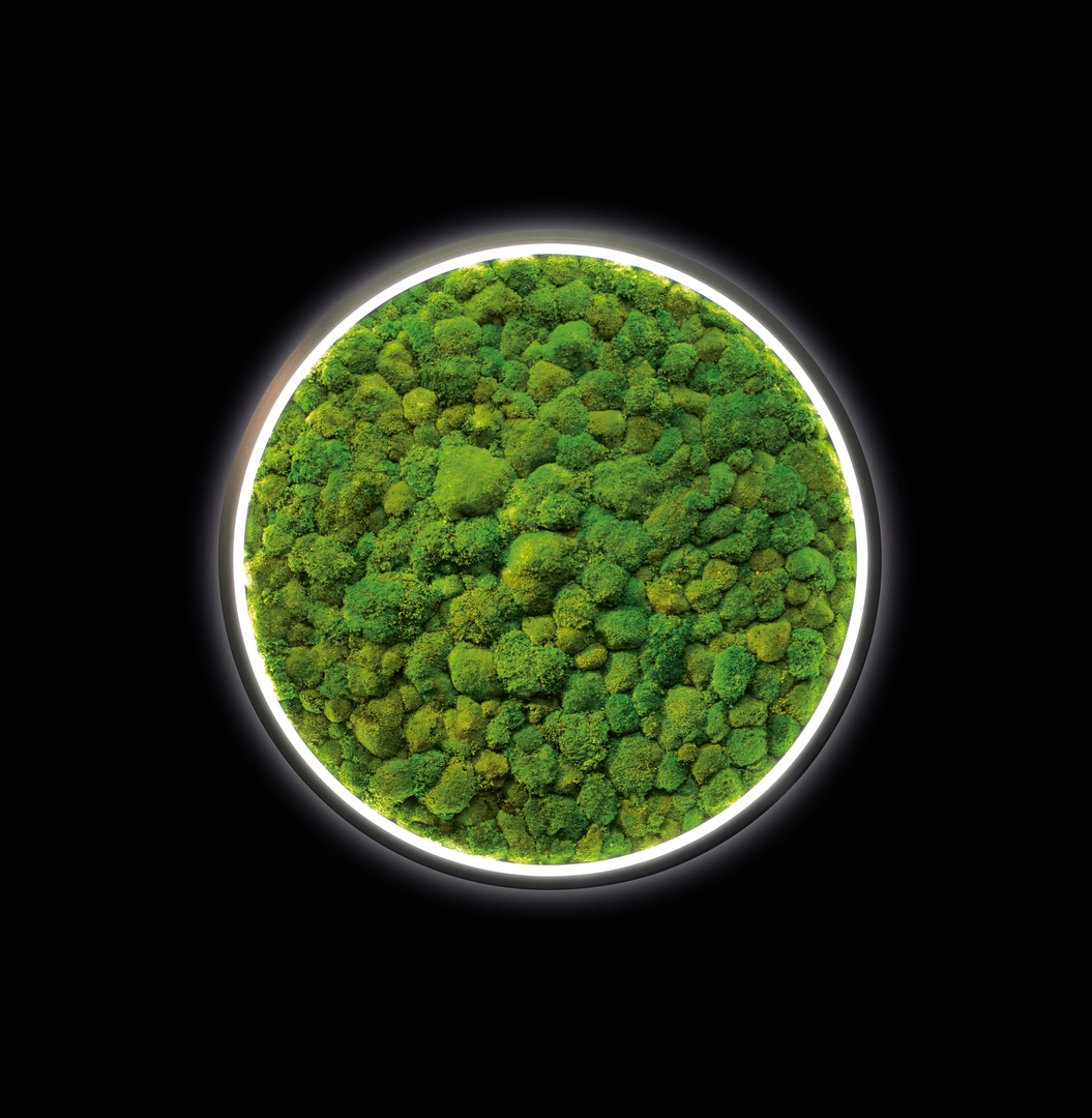 Dieses Gestaltungskonzept überzeugt sowohl visuell als auch haptisch. Die moosbegrünte LED-Ringleuchte erweckt angenehme Emotionen.