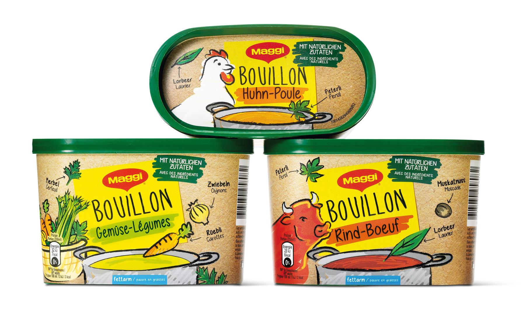 Maggi Bouillon Nature is the brand’s first bouillon with entirely natural ingredients. In order to stand out visually from the classic bouillon range, the agency developed a packaging that is noticeably different. The typography and illustrations, as well as the type of paper, were chosen to emphasise the product’s naturalness and simplicity. In order to target a health-conscious audience, the natural recipe and its main ingredients are not only depicted but also named, resulting in a refreshing bouillon packaging.