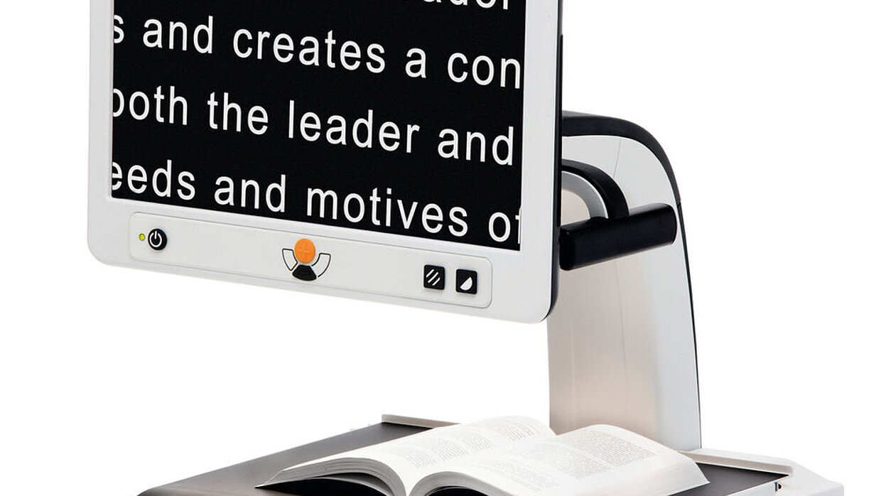 Die Videolupe MagniLink S unterstützt Menschen mit Sehschwäche, indem über das Kameraobjektiv Bilder oder Texte auf einen Computerbildschirm übertragen und dort vergrößert gelesen werden können. Das System kann überallhin mitgenommen werden und lässt sich einfach an einen Laptop oder Tischcomputer anschließen. Die Beine sind faltbar, sodass das Lesegerät dicht neben dem Laptop platziert werden kann. Die Komponenten in Orange zeigen an, wie das Gerät auf- und eingestellt wird. Das System verfügt über die neuesten technischen Standards, z. B. HDMI und USB 3.0, und benötigt keine Batterien, da es vom Computer aus mit Strom versorgt wird.