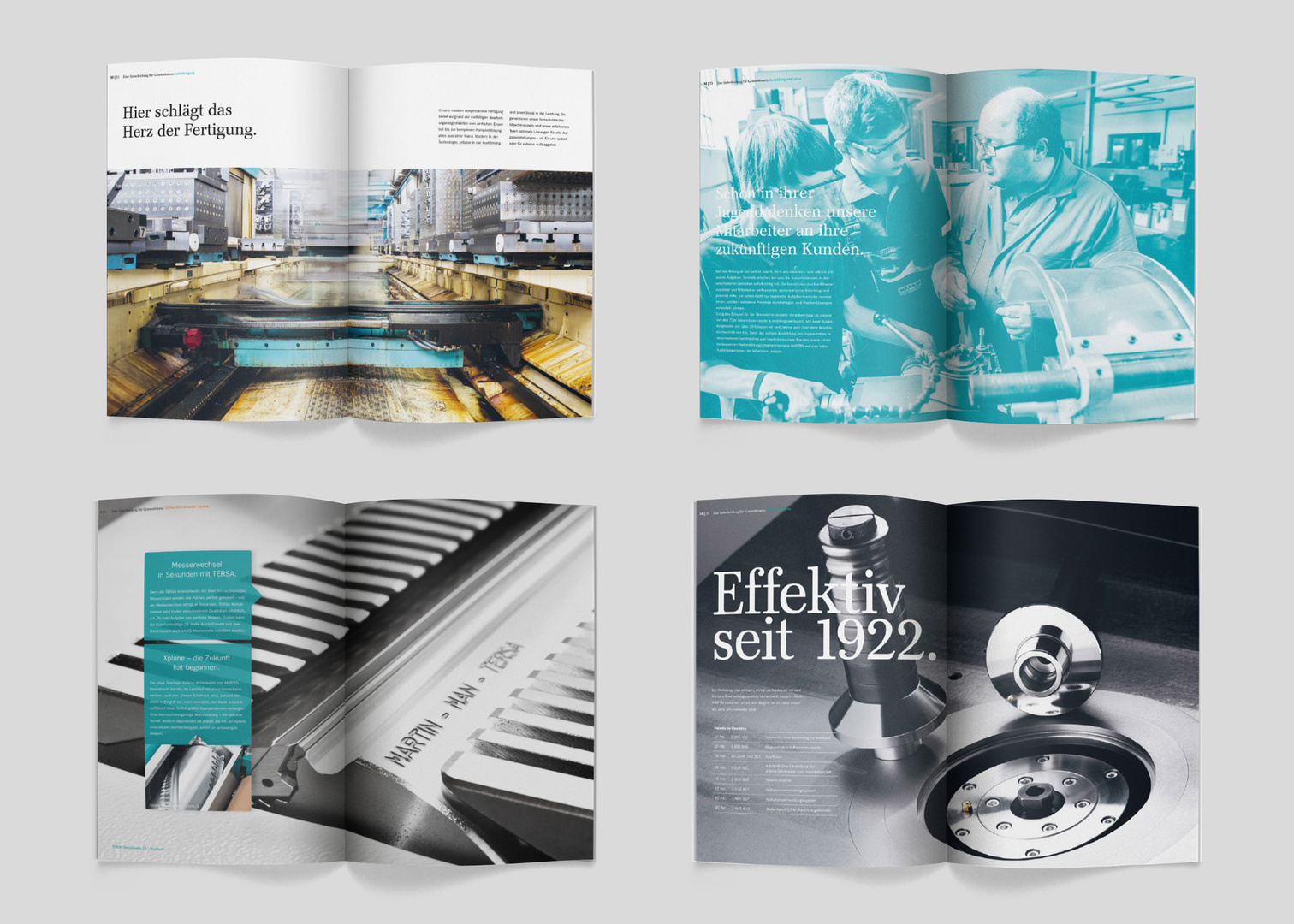 The corporate branding for the Bavarian woodworking machines company Otto Martin Maschinenbau leads the corporate identity, previously derived from interviews and workshops, in a new direction. The outcome is a content-driven and formal concept that expresses itself through visual language and typography. The existing colour code was rearranged to reflect the cycle of nature in order to promote, as the core statement, the longevity of the products’ life cycles. The presentation of categorised products was thus reinvented to reflect highly appraised “Made in Germany” quality.