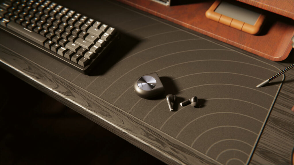 Der In-Ear-Kopfhörer Master Buds präsentiert sich sauber und geometrisch im formalen Aufbau, wobei der Präzision der Linienführung sanft gerundete Konturen zur Seite gestellt werden. Besondere Beachtung verdient das Ladecase. An der Vorderseite wurde hier ein schimmerndes, kreisrundes Element aus Metall eingelassen, das der CD Reverenz erweist und damit hohe Klangqualität symbolisiert. Das Flip-Top-Gehäuse bietet eine intuitive Handhabung und ist mit einer IPX5-Zertifizierung gegen Feuchtigkeit geschützt.