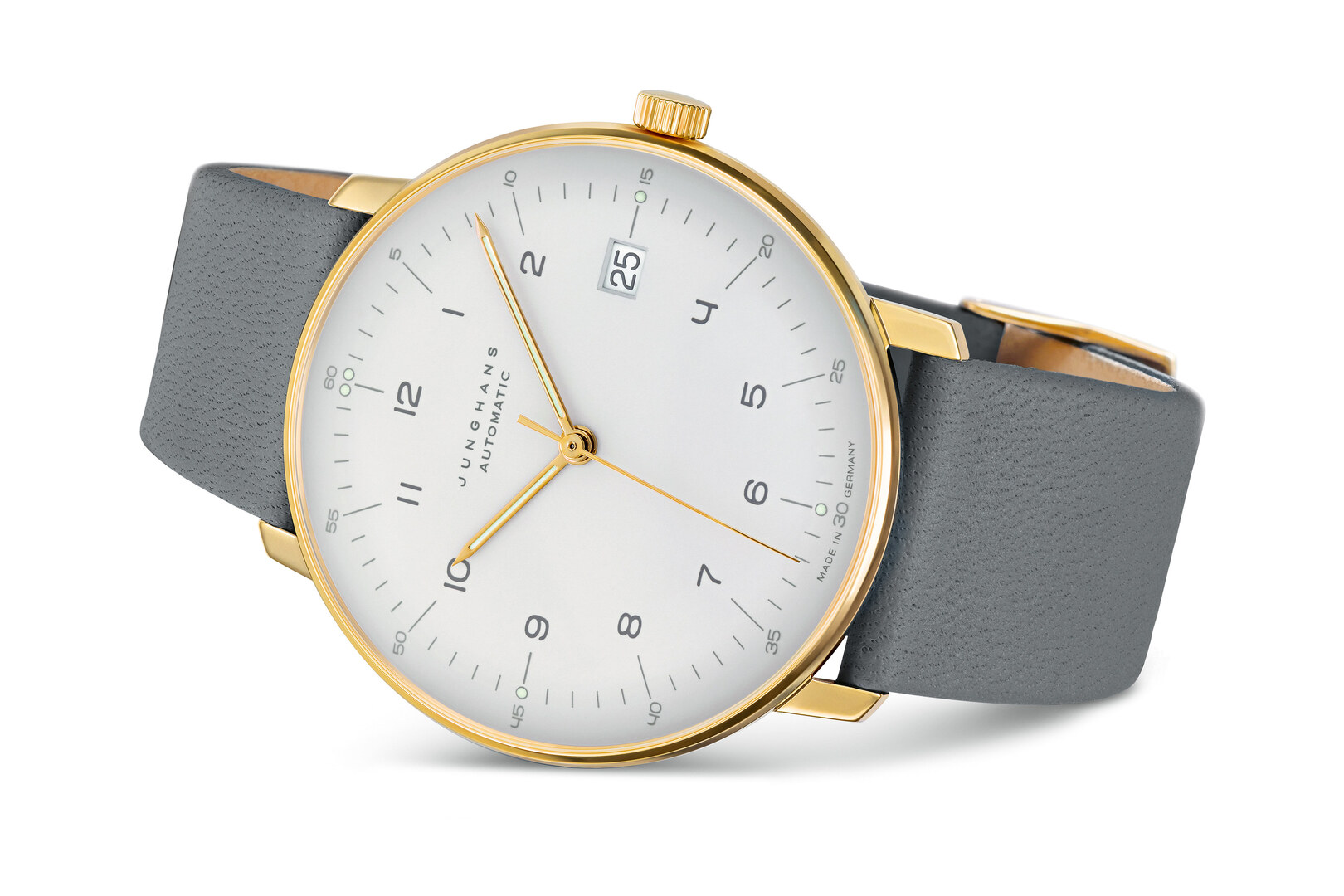 Dieses Modell ist eine leichte Adaption des Originalentwurfes des Schweizer Bauhaus-Gestalters Max Bill, der 1961 für Junghans eine Armbanduhrenlinie entwarf. Die neue farbliche Interpretation unterstreicht die klare und reduzierte Formensprache des Uhrenklassikers: Dezente Grau- und Goldtöne stellen die minimalistische Gestaltung in den Vordergrund, das sandgoldfarbene Gehäuse tritt dabei in den Hintergrund. Das Zifferblatt ist klar angeordnet, gemeinsam mit dem gewölbten Glas wird eine gute Ablesbarkeit möglich. Grautöne in Zifferblatt und Band runden den puristischen Gesamteindruck ab.