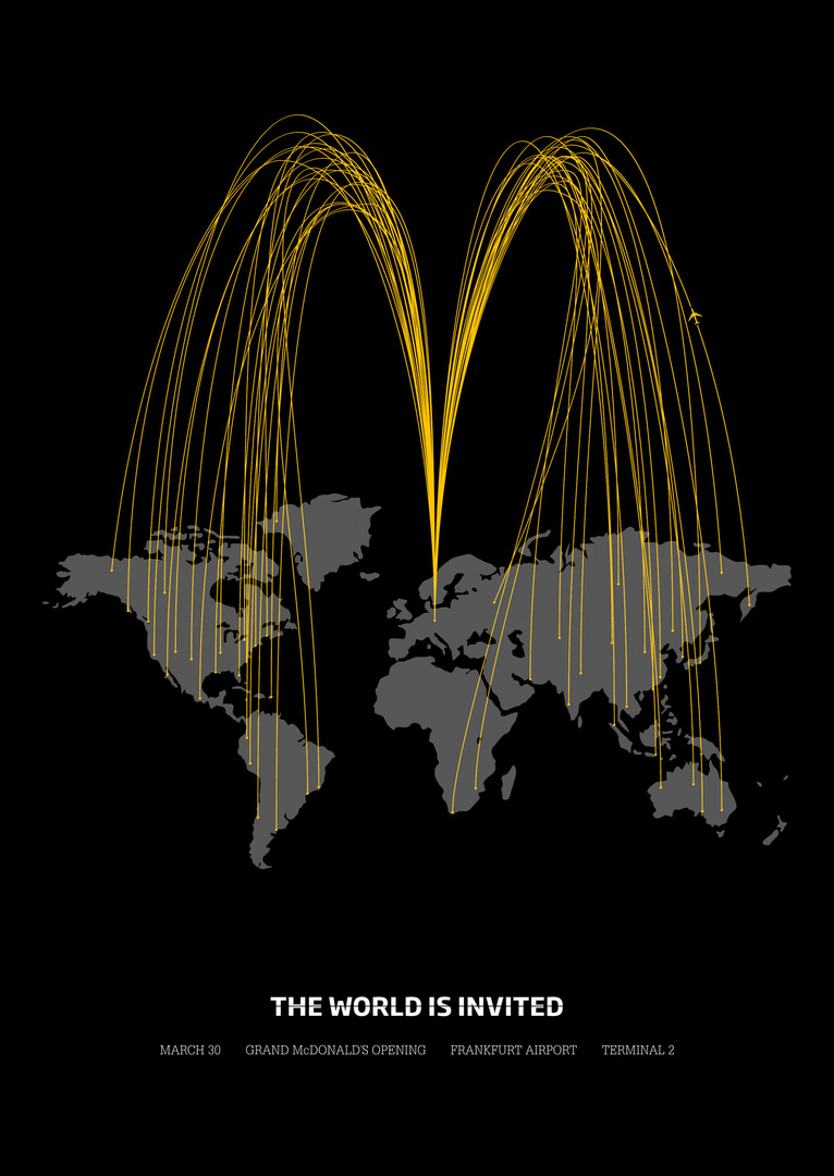 This advertising campaign was developed for the opening of Germany’s largest and most state-of-the-art McDonald’s restaurant at Frankfurt Airport. The challenge was to stand out from the mass of advertising at the airport and to blend the brand world of the fast-food chain with the airport world in a refreshingly relevant way. For the visual implementation, the design uses an instantly recognisable symbol from the airport world, the flight map. An eye-catching flight map was developed, in which the flight routes form the McDonald’s logo, while all flights have the same destination: the McDonald’s restaurant at Frankfurt Airport.