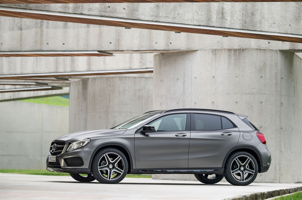 Der Kompakt-SUV GLA verbindet Designansätze aus der Coupé- und der SUV- Gestaltung. Powerdomes auf der Motorhaube und der Kühlergrill mit zwei Lamellen betonen die Breite des Fahrzeugs. Die Seitenansicht wird von der Dropping-Line geprägt, die sich aus dem Scheinwerfer heraus bis zum hinteren Radlauf spannt. Das niedrige Greenhouse, der hochgesetzte Fahrzeugkörper und die großen Radausschnitte verleihen dem GLA eine kraftvolle Anmutung. Das ausdrucksstarke und hochwertige Erscheinungsbild des Exterieurs setzt sich im Interieur konsequent fort.