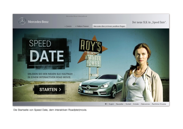 A car-breakdown in the middle of the Californian desert leads the user to a spectacularly choreographed speed date with an attractive woman in the new Mercedes-Benz SLK. The lavishly produced web special presents the new SLK, embedded in the plot of an interactive road(ster) movie, where the user literally sits in the car and is able to control the course of the encounter himself. Personalised film sequences as well as a multi-level integration with Facebook create a versatile, individual experience.