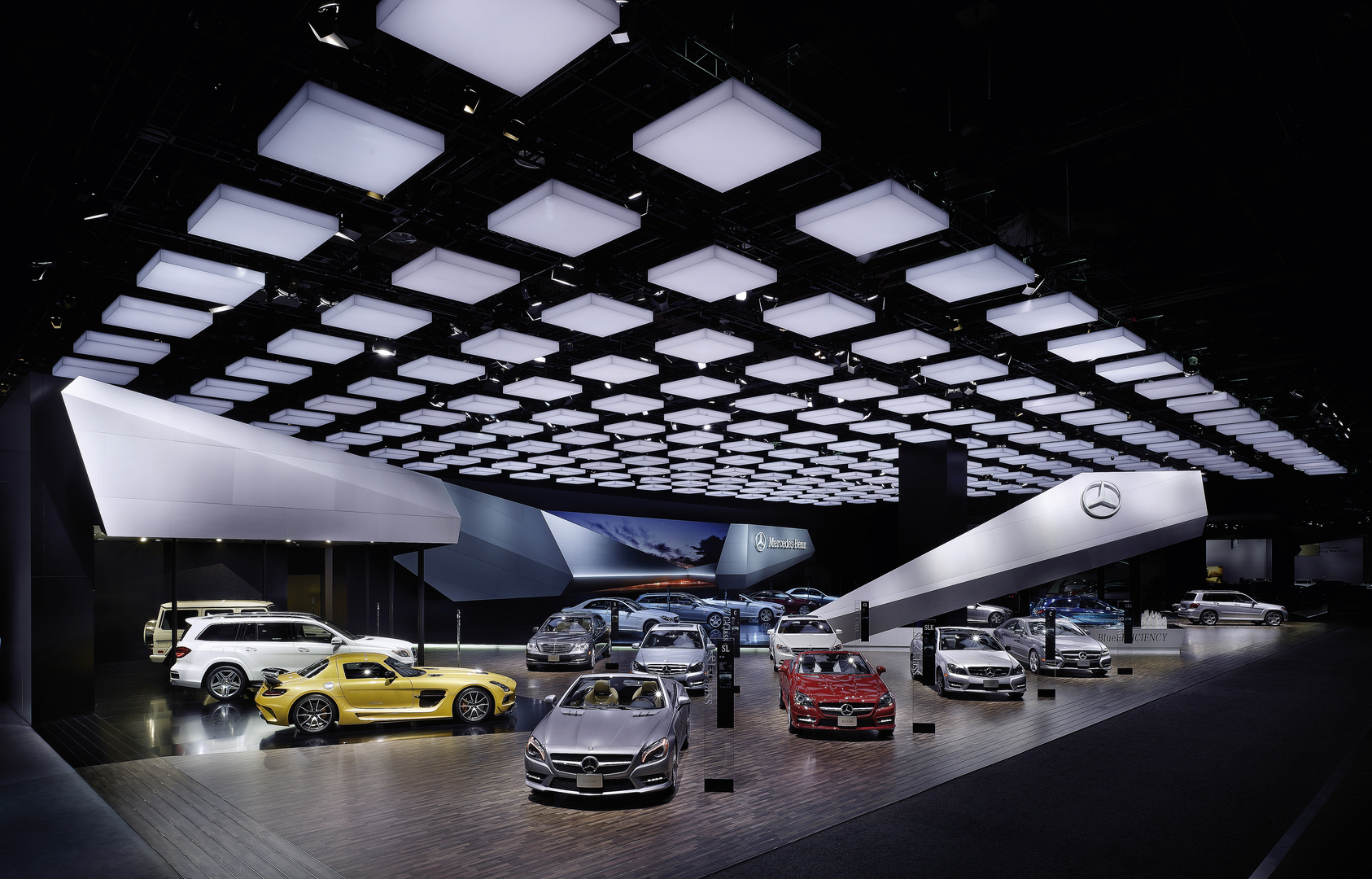 At the Detroit Auto Show, Mercedes-Benz presented five models of the new E-Class. A central grandstand staged the entrance to the stand and allowed visitors an elevated view of this world premiere. The silver, polygonal “brand ribbon”, typical of the trade fair architecture of Mercedes-Benz, formed a seamless transition into a ceiling-high LED display. A brand film transformed the stand into an external urban scene that captures the dynamics of driving. Time-lapse techniques, trick layering, music and lighting were combined to create an immersive brand experience.