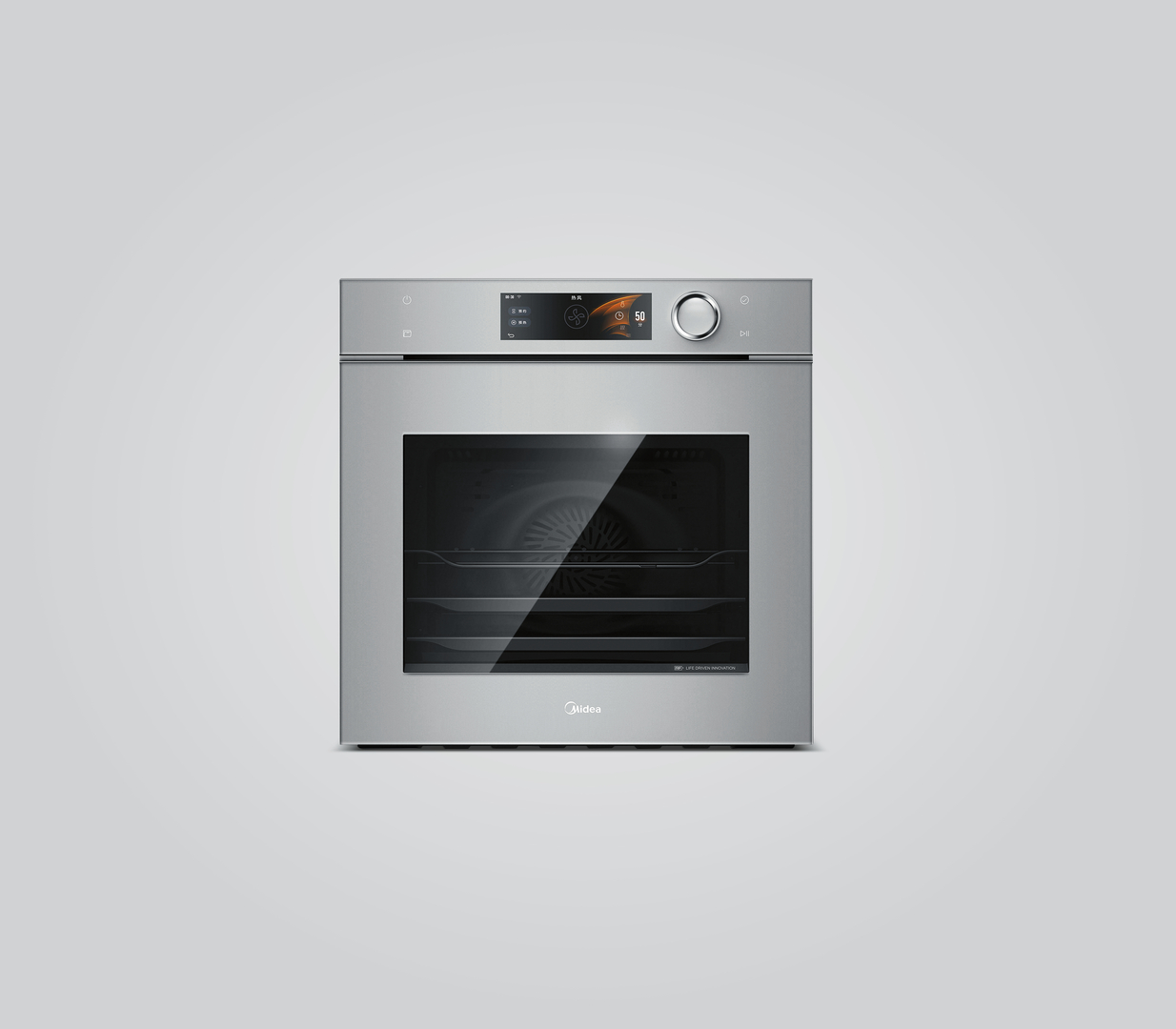 Der intelligente Einbaubackofen hat eine reduzierte Frontgestaltung, die ohne Türgriff auskommt. Zur Öffnung genügt lediglich ein leichter Druck. Dank dieser Gestaltung und seiner silberfarbenen Optik fügt sich der Midea Handless Oven nahtlos in ein modernes Küchenumfeld ein. Die Bedienung erfolgt über einen Drehknopf und einen TFT-Bildschirm. Die grafische Benutzeroberfläche bildet die verschiedenen voreingestellten Rezepte und Programme deutlich ab.