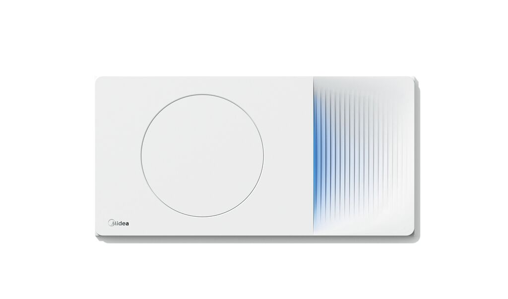 Hervorstechendes Merkmal der Badezimmerklimaanlage Midea LB ist ein kreisförmiges Luftauslassdesign, das um 360 Grad gedreht werden kann, um den Luftstrom in jede beliebige Richtung zu leiten. Wenn die Anlage nicht in Betrieb ist, wird der Luftauslass durch eine Blende verschlossen, um ein sauberes Gesamtbild zu erzielen. Rückmeldung über den Betriebszustand gibt eine dezente Beleuchtung, die sich über die strukturierte Hälfte der Vorderseite ausbreitet und je nach Farbe Kühlen oder Heizen symbolisiert.