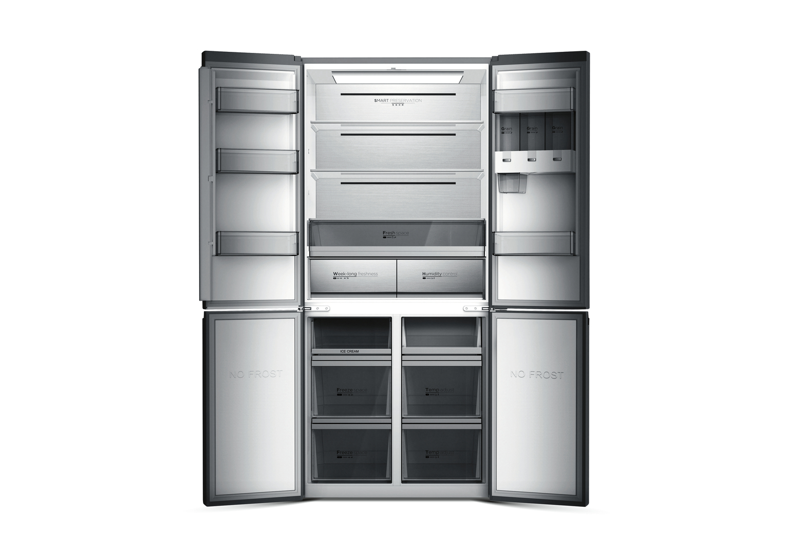 Eine architektonische Formensprache und eine hochwertig anmutende Front kennzeichnen den Midea M-Fresh Refrigerator. Griffe aus Aluminium wurden für ein ebenes Erscheinungsbild präzise in die Türen eingearbeitet. Der geräumige und helle Innenraum bietet viel Platz zur Aufbewahrung von Lebensmitteln, die durch eine innovative Kühltechnologie besonders lange frisch gehalten werden.