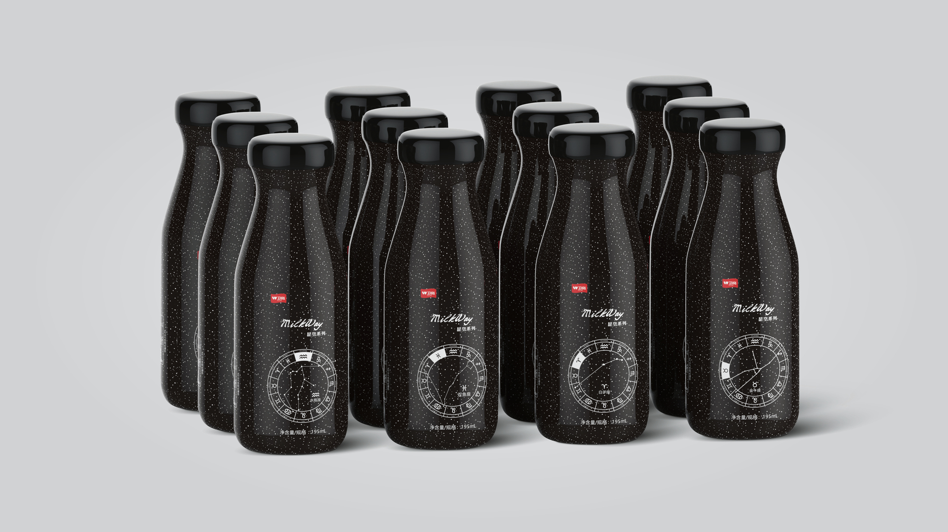 The design of this milk bottle is inspired by a legend from Greek mythology in which the Milky Way was formed by herds of cattle whose milk turned the dark-blue sky white. When the bottle is filled with milk, the white liquid makes the stars and constellations visible. After drinking the milk, the cleaned bottle can be used to project symbols of these stars and constellations in the dark of night by simply shining a torch into the bottle. It can thus be turned into a starry sky projection lamp.