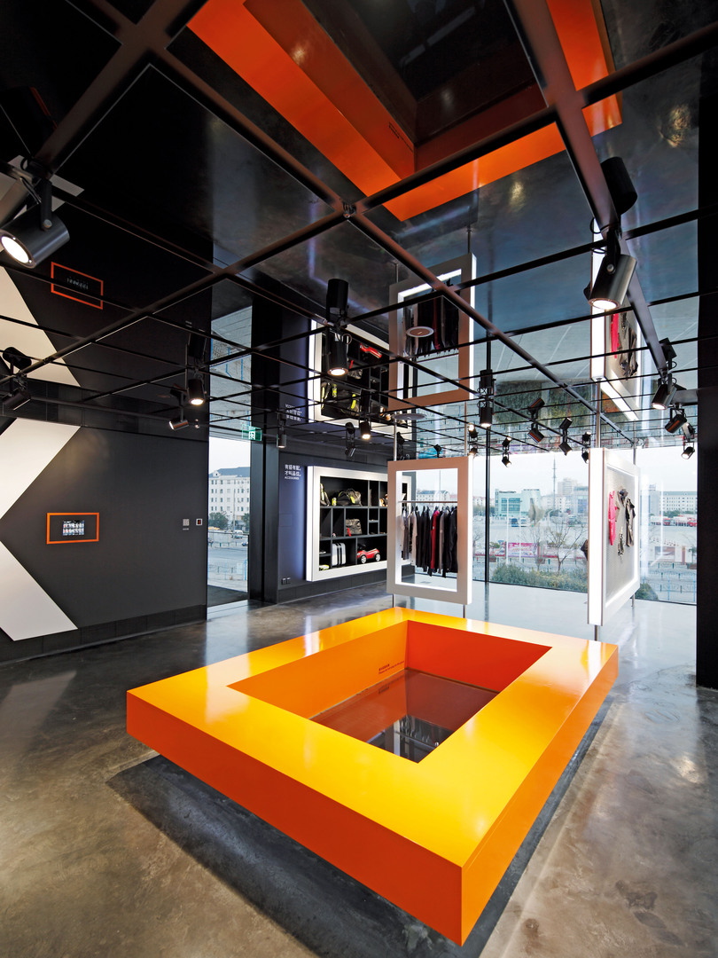 Visualising the extraordinary characteristics of the MINI, this brand architecture stages the car on various levels. The MINI Experience Centre is a 17-metre-high “walkable sculpture” consisting of a steel frame to which three boxes are attached, with each featuring an individual theme. The boxes are shifted in different directions in order to distinguish the floors from each other and to foster uniqueness. The floors are accessed via an outdoor staircase that exhibits additional information about the MINI between each storey.