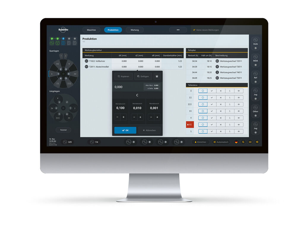 Considering the rapid change in technology, this user interface was designed with the requirement of individual configurability. Implemented with a systemic approach, it is based on a modular structure which aims to ensure that it can react flexibly to changes in the market. This human-machine interface was developed for the latest generation of multi-spindle automatic lathes from the company Schütte. Addressing the demand of being highly productive, precise, future-proof and flexible, it is custom-tailored to their machines.