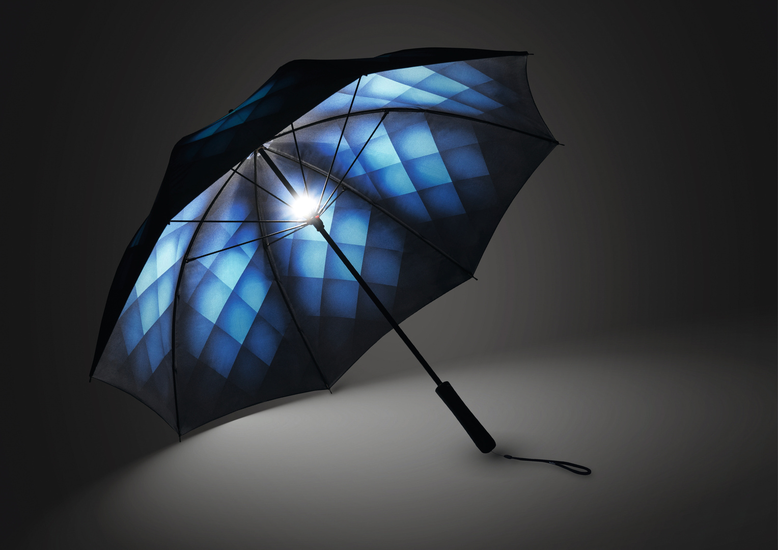 Moolux ist ein Regenschirm mit integrierter LED-Leuchte. Wird diese eingeschaltet, erhöht sich die Sicherheit des Nutzers beim Gehen in der Dunkelheit. Die Auffälligkeit des Schirms wird durch die Bespannung verstärkt: Das bunte Satingewebe ist mit einem grafischen, prägnanten Rauten-muster versehen. Der Griff und der Stock sind aus eloxiertem Aluminium, die Paragonstangen aus glasfaserverstärktem Kunststoff hergestellt. Das Ergebnis ist ein leichter Schirm mit einem ausgewogenen Gewichtsverhältnis.