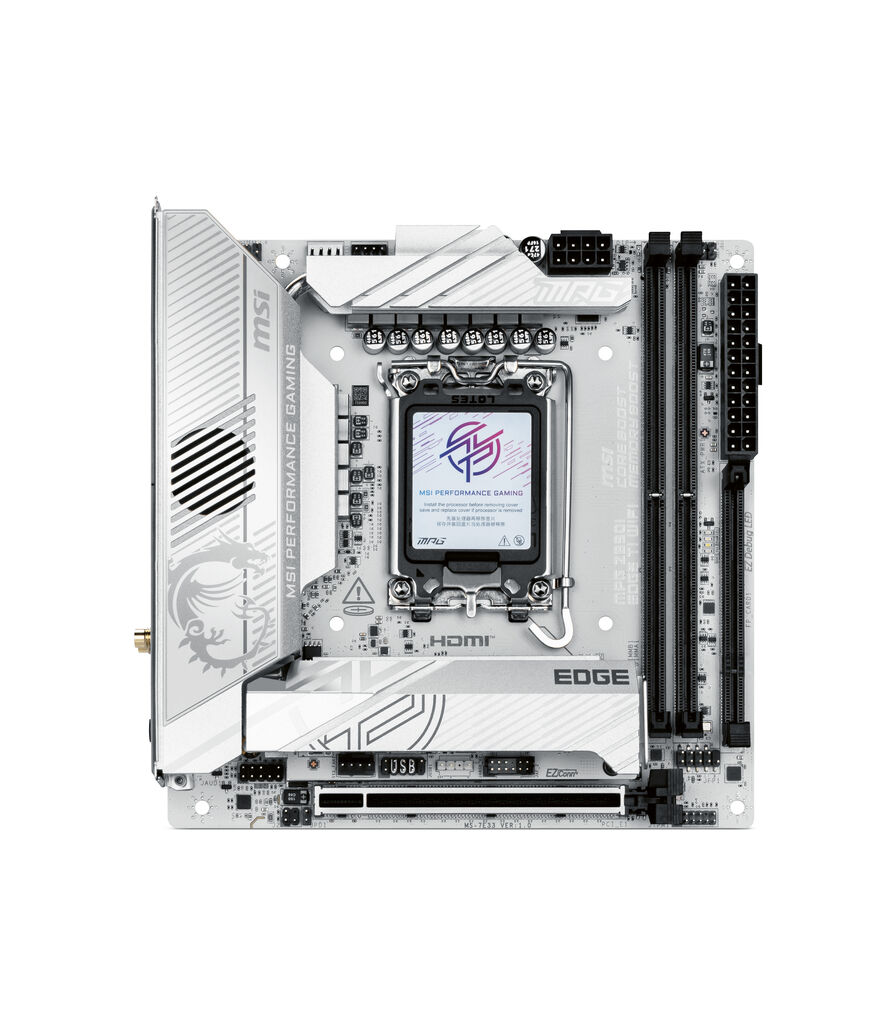 Das elegante, weiße Mainboard MPG Z890I EDGE TI WIFI überzeugt mit Flexibilität und Leistungsfähigkeit – ohne Abstriche bei Form oder Funktion.