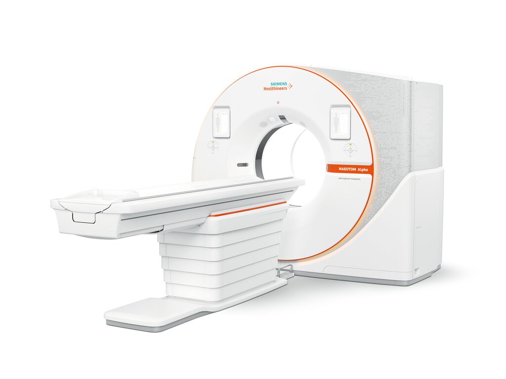 Ausgestattet mit einem quantenzählenden Detektor, der sowohl die Anatomie als auch die Gewebezusammensetzung in hochaufgelöster Bildqualität und bei geringer Strahlendosis darstellt, markiert NAEOTOM Alpha das High-End-Segment in der CT-Bildgebung. Ziel war es, die innovative Technik visuell erfahrbar zu machen und den Scanner gleichzeitig mit einer einladenden, menschlichen Note auszustatten. Dieser Anspruch wird unter anderem erfüllt durch den dezenten Einsatz eines grafischen Punktmusters, welches das Quantenzählen in stilisierter Form darstellt; zudem zeigt das Design eine klare Fokussierung auf den sich sanft öffnenden Trichter. Für gute Reinigungseigenschaften sorgen die abgeschrägten Flächen und der konsequente Verzicht auf überflüssige Ecken und Kanten.