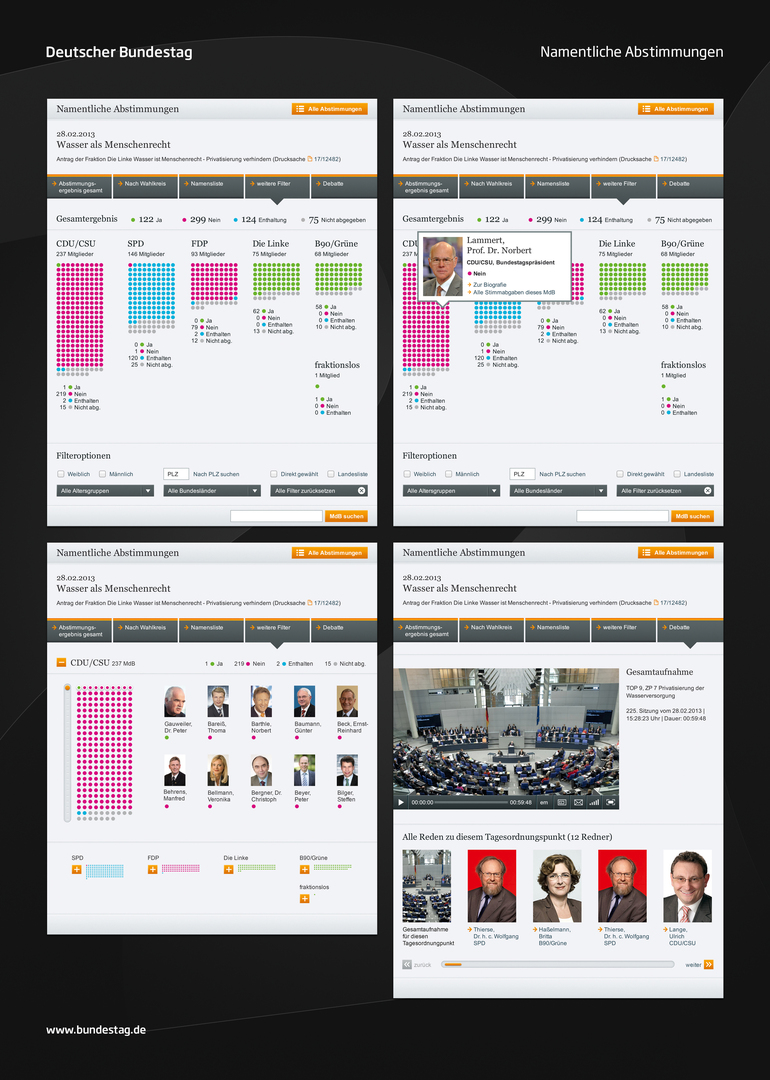 This visualisation of roll-call votes at the German Parliament aims to represent and document a striving towards transparency in politics. The website module allows citizens to become informed about the results of any roll-cast vote in Parliament, and to see how many parliamentary representatives from which party voted yes or no on the issue discussed. It combines the representatives’ voting behaviour with auxiliary information, such as party affiliation, constituency or postal code. Users can choose which particular roll-cast vote they want to have visualised.