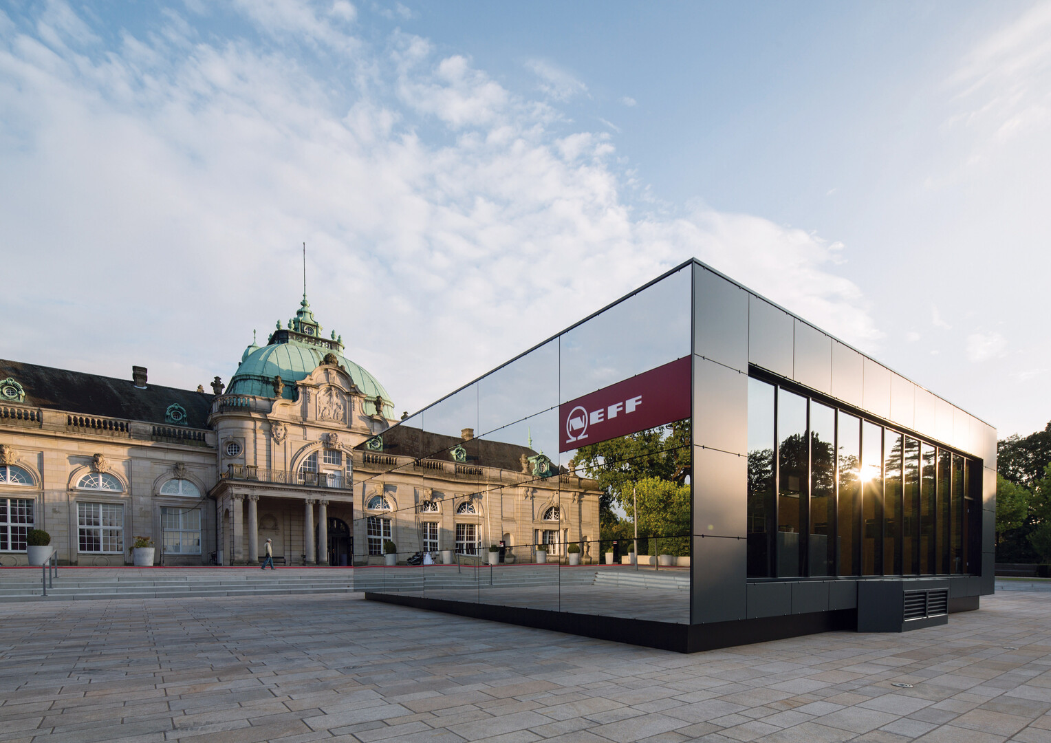 The temporary exhibition pavilion fascinates in how it merges with the environment despite its size, by reflecting both the historic buildings and the park landscape. The idea of integrating such an exhibition pavilion into the public space is as simple as it is astounding. The cube exudes a quiet and peaceful appeal with an interior that optimally directs visitors’ attention to the modern exhibits and underlines the manufacturer’s high design standards.