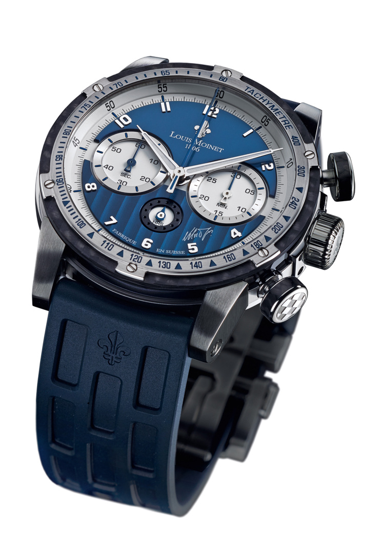 Die Nelson Piquet ist ein sportlicher Au-tomatik-Chronograph mit Dualdrücker. Er wurde in Zusammenarbeit mit dem drei-fachen Formel-1-Weltmeister Nelson Piquet entwickelt. Daher weist die Uhr eine Reihe von Rennsport-Verzierungen auf wie die in den Drücker eingelassene karierte Ziellinienflagge, Piquets Unterschrift bei der Fünf und die rückwärtige Anzeigengravur, die die Erfolge des legendären Rennsportpiloten heraufbeschwören. Auf der Lünette aus Stahl und Karbonfaser befindet sich eine Geschwindigkeitsanzeige. Das Zifferblatt ist in der unteren Hälfte mit einem Zierschliff aus geraden, breiten Streifen graviert, der an den Kühlergrill historischer Rennwagen erinnert. Das Uhrarmband besteht – wie es sich für den Motorsport gehört – aus Gummi. Die rhodiumbeschichteten Stunden- und Minutenanzeiger heben sich gut lesbar vom blauen Hintergrund ab und leuchten im Dunklen.