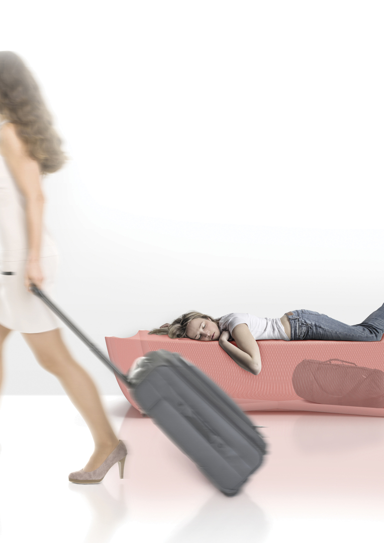 Air travel is not always a breeze. It is common for passengers to be stranded in airports. It is a tiring process often compounded by jet lag. Lastly, it all begs the question: why is it so difficult to sleep in an airport? Part of the problem is the belongings we carry with us: our passport, travel money, and expensive electronics, to name a few. How do we sleep soundly with our possessions in an unfamiliar environment, particularly if we are travelling alone? The Nest bed is designed for both comfort and storage. It supports the user like a hammock with the use of an elastic fabric mesh, while the internal storage compartment is accessed through a zip at the top. Before lying down, simply unzip the top of the Nest bed to deposit valuable belongings in the compartment and zip it back up. Lying down, the user sleeps knowing that no one can simply walk off with his or her bag. The unique hoop zip design means that the Nest bed can easily be opened and closed when vacant. Comfort is optimised because the zip is shrouded in felt trim and the design ensures the hoop is at the foot-end of the bed when closed. The fabric mesh has been designed so that the contents of the bed are always visible. This enables airport security to verify that there is no unattended luggage or suspiciously hidden items. Simply comprised of a tubular metal frame and fabric mesh, Nest is also lightweight, portable and can be easily positioned in appropriate areas of the airport.