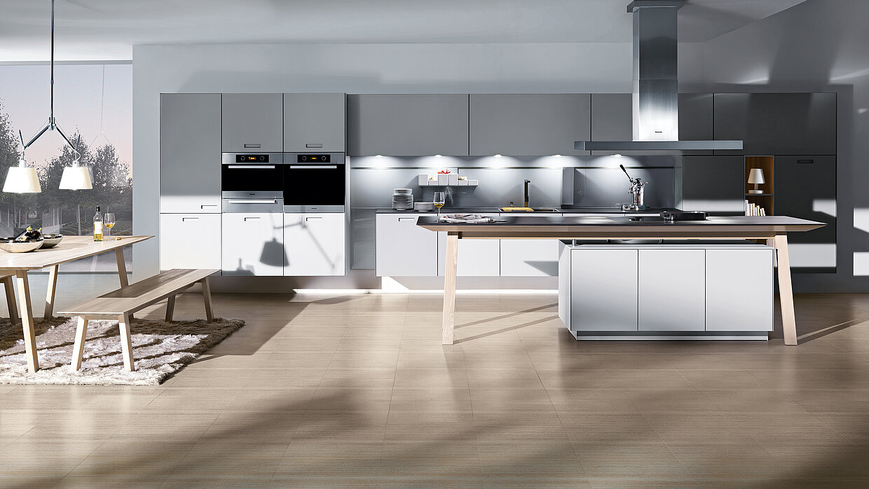 Reduktion bedeutet die Konzentration auf das Wesentliche. Der Kochtisch aus der Collection next125 greift diesen Grundsatz auf. Er erhält seine besondere Ausstrahlungskraft durch eine kompromisslose Klarheit. Unter Beibehaltung seiner Individualität fügt er sich harmonisch in jede Umgebung ein. Eine sich nach außen verjüngende Arbeitsplatte zeigt eine besonders schmale Kante, die den filigranen Charakter der Kochinsel unterstützt. Die Distanz zu den Unterschränken und deren zurückversetzter Sockelblende ergibt eine schwebende Anmutung.