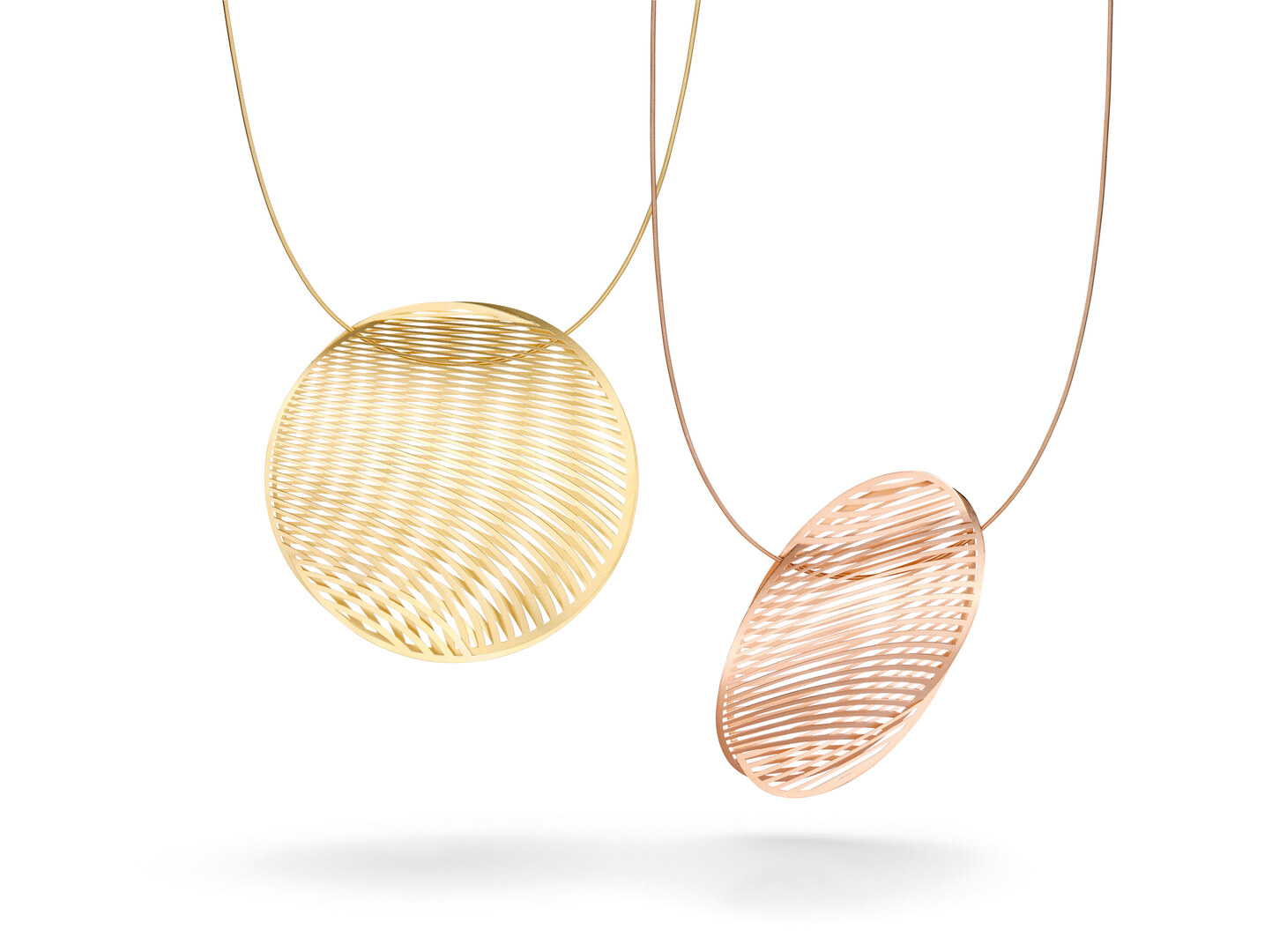 Bei natürlichen Erscheinungen wie der Fata Morgana wird der sinnlichen Wahrnehmung eine scheinbare Realität vorgegaukelt. Die Gestaltung des Anhängers Mirage spielt gekonnt mit solchen Phänomenen. Ausgangspunkt war die Frage, ob sich Edelmetall so verarbeiten lässt, dass es schillernd und durchscheinend wirkt und dabei die Illusion einer Luftspiegelung erzeugen kann. Mittels einer innovativen Lasertechnik sowie neuer Fertigungsverfahren entstand ein Schmuckstück von besonderer Ausdruckskraft. Inspiriert von den natürlichen Strukturen von Blättern, Federn und Libellenflügeln, bestehen die Grundformen von Mirage, Kreise und Ovale, aus feingliedrigen, in ihrer Stärke anwachsenden Lamellen. Für jedes einzelne Schmuckstück werden zwei Formen mithilfe einer geschickten Technik ineinandergesteckt. Durch Überlagerung erzeugen die Lamellen die Illusion eines Glaskörpers, die Luft im Inneren der Schmuckstücke scheint zu flirren. Dies bedingt einen schillernden und durchscheinenden Effekt, der den Materialien Gold und Platin eine besondere Wirkung verleiht. Federleicht und bei jeder Berührung schwingend, bieten die zarten Schmuckobjekte auch ein haptisches Erlebnis: Mirage fühlt sich samtweich und geschmeidig an. Getragen wird der Anhänger an der Niessing Schnur, die dabei völlig im flirrend anmutenden Inneren des Schmuckstückes verschwindet. Was sich in der Gestaltung des Anhängers Mirage manifestiert, ist ein faszinierendes Spiel mit der Illusion – eine formgewordene Vision von Schwerelosigkeit in Gold und Platin.