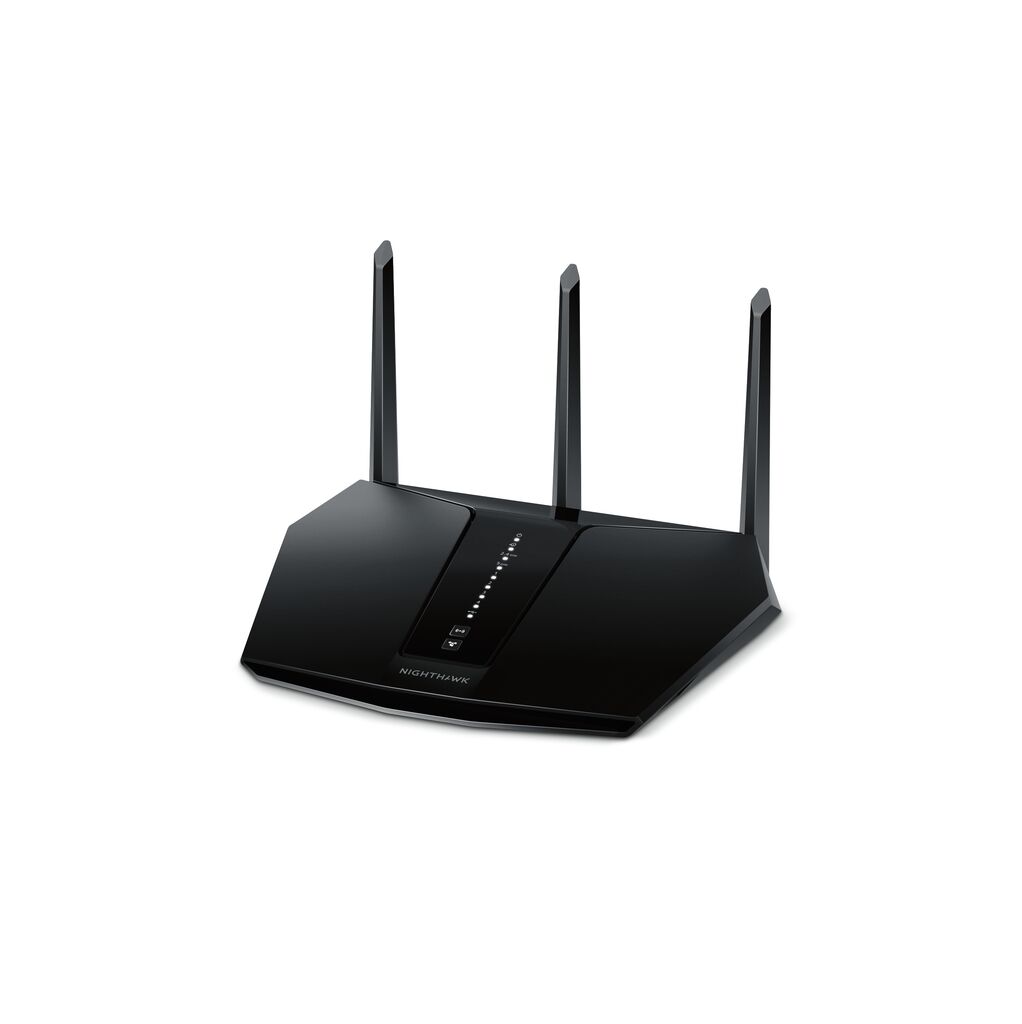 Die eindrucksvolle Gestaltung des Nighthawk RAX30 by NETGEAR repräsentiert die leistungsstarke Technologie im Innern und kontrastiert die hochglänzende Oberfläche in der Mitte mit dem matten Gehäuse.