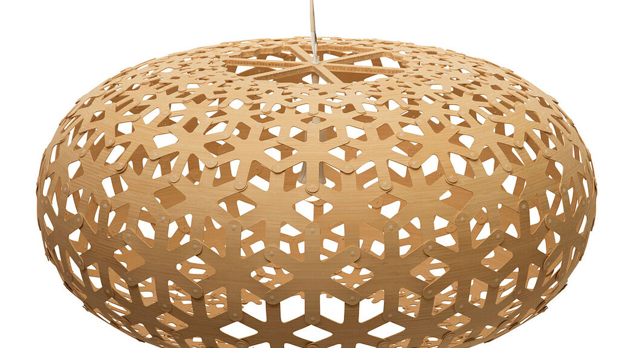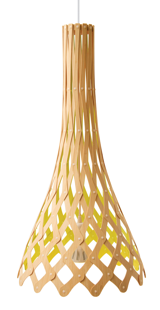 Die Pendelleuchte Nikau wird aus FSC-zertifiziertem Bambusholz gefertigt und in Einzelteile zerlegt verschickt. Vor Ort wird sie einfach mittels Einsteck-Klemmen aus Nylon zusammengebaut. Es gibt zwei Varianten: Die lange Version passt gut in die Ecken eines Raumes; mehrere nebeneinander dienen als Raumteiler. Hingegen eignet sich die hier gezeigte Kurzversion für die direkte Beleuchtung, beispielsweise über Tischen. Mit ihren Schatteneffekten erzielt die Leuchte eine dynamische Wirkung. Der Name Nikau bezieht sich auf die einzige einheimische Palmenart Neuseelands.
