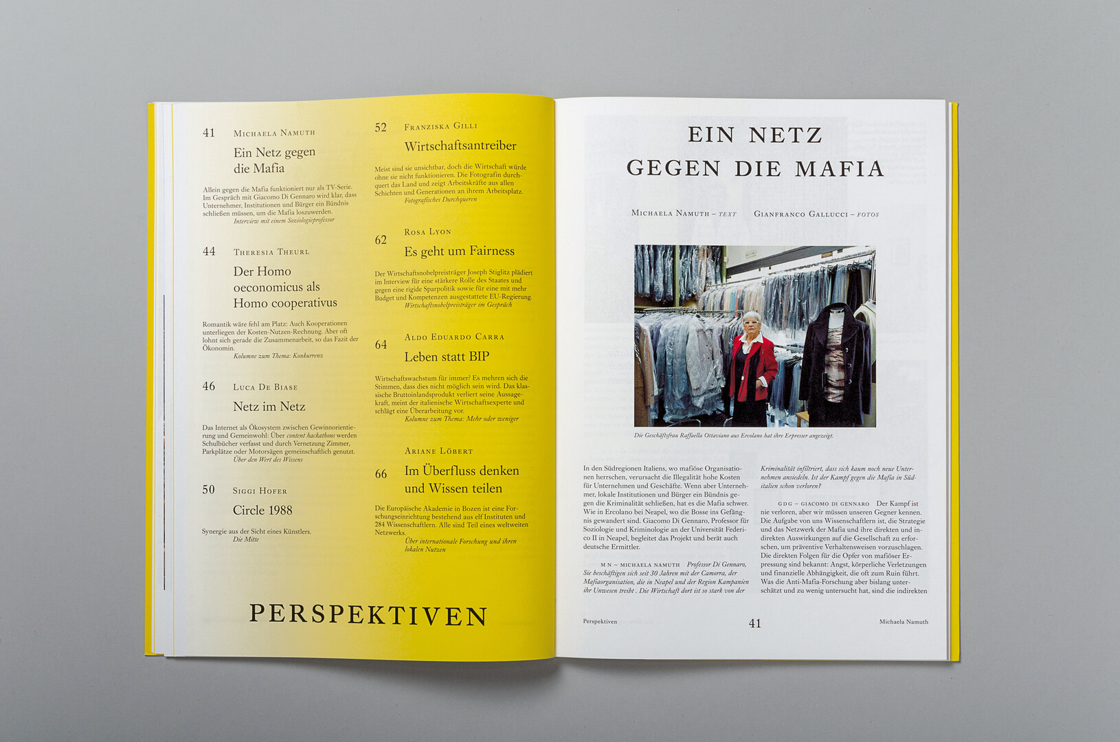 The business magazine Nord & Süd was born out of the needs of South Tyrol’s location development agency BLS. In order to call attention to the multifarious local economy, it compiles features by authors, journalists, photographers and artists from the region. The economic situation is thus portrayed in relation to a larger whole through high-quality journalism. The magazine is published annually and builds on a basic graphic grid allowing the visual appearance of each edition to evolve in terms of typography, imagery and colours.