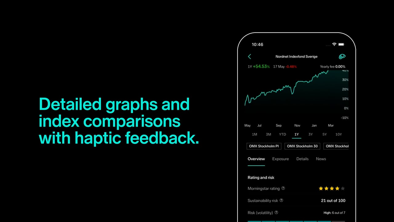 Nordnet is a pan-Nordic financial services company based in Stockholm. Its digital platform provides users with access to professional trading tools in a simple and user-friendly way. Convenient features include a monthly savings function that enables hassle-free set-up of automatic investments, price alerts, automatic calculations and a watchlist. A “get started” tutorial and flowing guidance help users discover investment opportunities in line with their savings goals and personal values. Detailed graphs and index comparisons with haptic feedback support informed decisions.