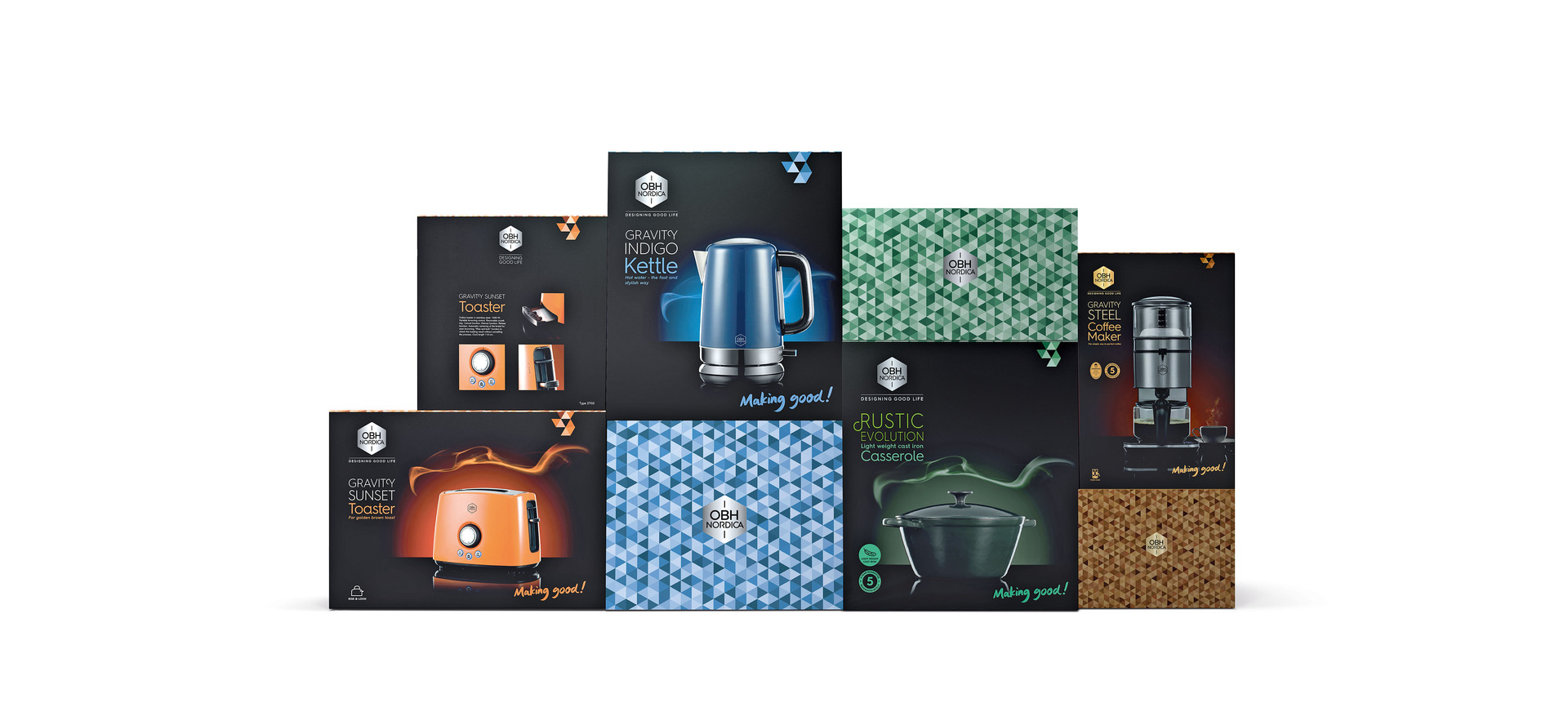 OBH Nordica is the Scandinavian market leader in small household appliances and kitchen equipment, whose product development is often conducted in collaboration with Scandinavian designers. In the course of a redesign of the brand, the product range was divided into various categories that differ in terms of their packaging concepts. The product line playfully uses colour contrasts of blue and black, and it features an eyecatching graphic pattern in the lower packaging section. The logo resembles a seal, thus communicating tradition, quality and innovative performance.