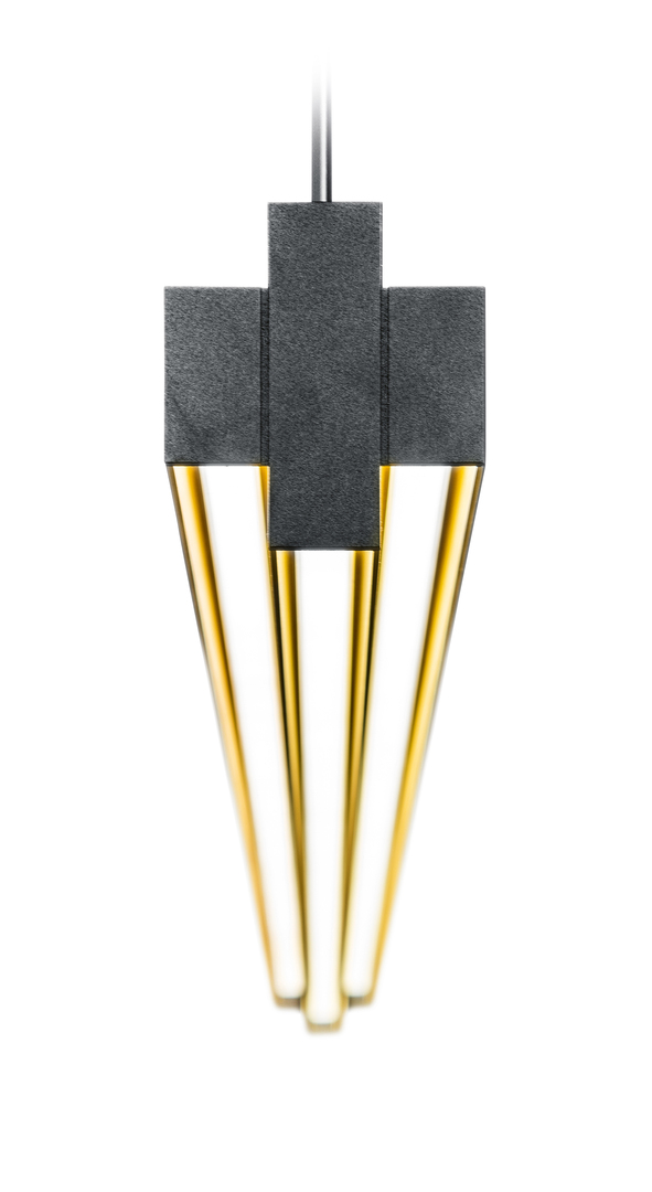 Zielführende Prämisse bei der Gestaltung von One-And-Only war es, ein lineares Leuchtenprofil zu schaffen, das auch im ausgeschalteten Modus Aufmerksamkeit weckt. Das kreuzförmige Profil des prägnanten Gehäuses ermöglicht bis zu fünf Lichtlinien: drei für eine direkte und zwei für eine indirekte Beleuchtung von Tresen, Empfangstheken oder Konferenztischen. Neben weiteren Ausführungen ist die Leuchte mit eloxierten Metallseiten im Farbton Gold Champagne sowie schwarzen Endkappen erhältlich.
