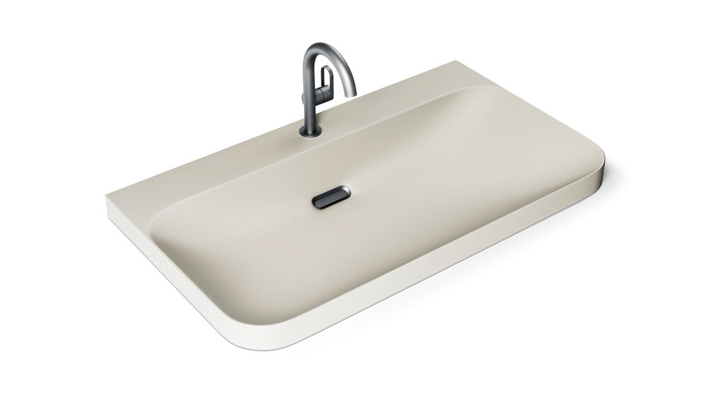 Das Aufsatzwaschbecken Optimize zeichnet sich durch seine flache Bauweise und eine weiche fließende Linienführung ohne sichtbare Übergänge aus. Die sanft gerundeten Ecken der hinteren Seite verleihen ihm eine organische Anmutung, während die klar definierte vordere Kante für eine präzise Abgrenzung sorgt. Der bündig integrierte Ablauf greift die Formgebung des Beckens auf und fügt sich harmonisch in das Gesamtbild ein. Das in den rückwärtigen Bereich verlegte Abflusssystem ermöglicht eine platzsparende Installation im Unterschrank.