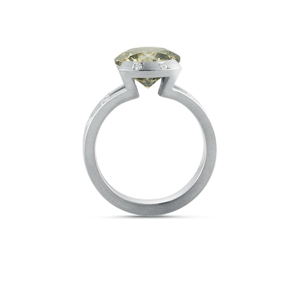 Der aus einer hochwertigen 950er-Platin-Legierung hergestellte Solitärring vereint scheinbar Gegensätzliches: Trotz des opulenten Mittelsteins, einem seltenen grünen Diamanten von beachtlichen 4,5 Karat, sowie der zwölf weiteren kleinen weißen Brillanten hat das luxuriöse Schmuckstück eine eher puristische Wirkung. Ursache dafür ist die innovative Fassung, die den facettiert geschliffenen Diamanten gekonnt in die Form der Ringschiene integriert, anstatt darüber zu thronen.