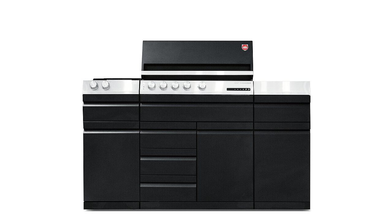 Ihr beeindruckendes Erscheinungsbild verdankt diese Outdoor-Küche einem Gestaltungsansatz, der auf die edle Anmutung hochwertiger Materialien setzt. Eine bis ins Detail durchdachte Funktionalität spiegelt sich vor allem in der Formensprache der Bedienelemente wider. Das stimmige Zusammenspiel der Materialien äußert sich in reizvollen Farbkontrasten, wobei der schwarze Korpus in Kombination mit Edelstahloberflächen eine markante Präsenz erzielt.