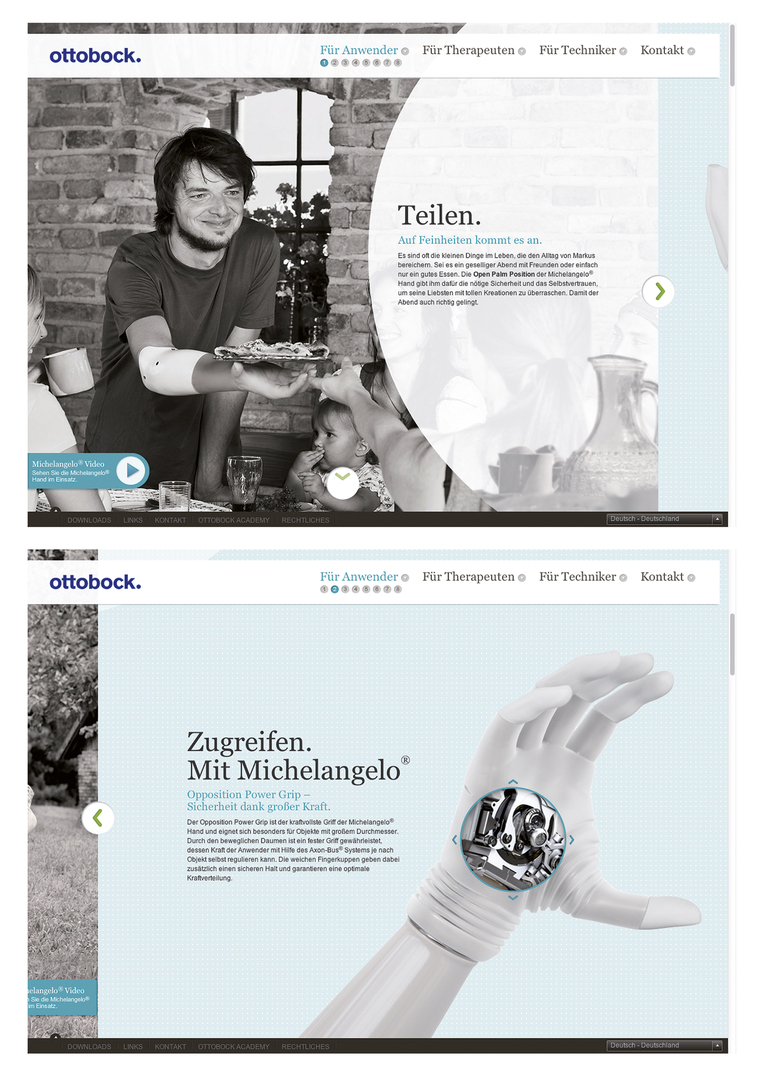 The microsite “Living with Michelangelo” stages an explorative world revolving around the prosthesis of the same name. It presents consumer benefits in a clear and objective manner, instantaneously linking them to the respective technical feature. The site intercorrelates the visual and contextual perspectives so that users may experience how technology meets the challenges presented by everyday situations. The quality of the prosthesis is thus made accessible for patients, technicians and therapists.
