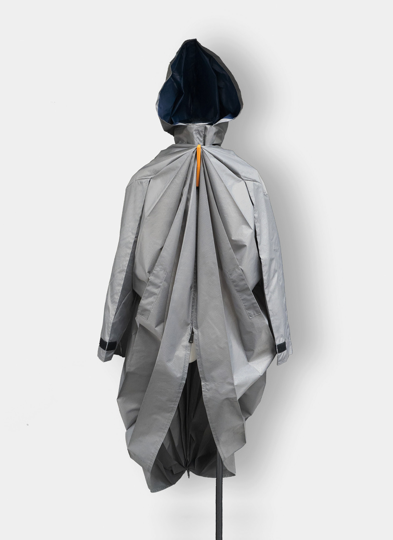 Oval Coat is made of 100% polyester fabric with a TPU coating that gives the surface a lotus effect, expelling heat and moisture from the inside along with the water. Putting on the raincoat is similar to wearing a cloak, and taking it off is even easier: simply unzip and gently shake vertically for five seconds before folding the coat away. With a super spacious volume, the user can carry a backpack under the raincoat without affecting movement.