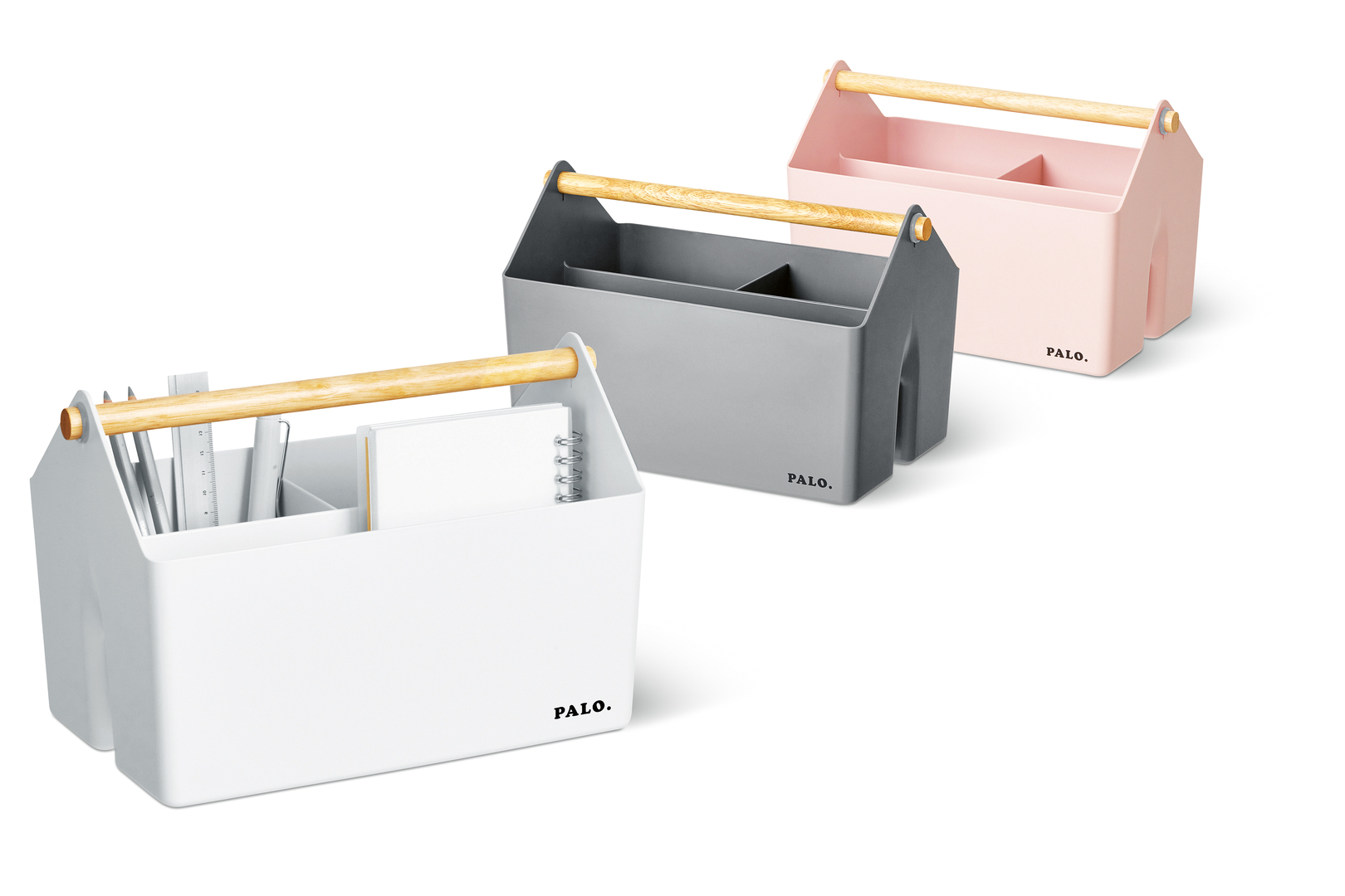In dem Korb PALO. lassen sich dank seines nutzerfreundlichen und einfachen Designs bequem kleinere Gegenstände aufbewahren. Sein Korpus besteht aus Kunststoff, was ihn robust, dabei gleichzeitig leicht macht. Der Griff ist aus Holz gefertigt und fühlt sich warm und angenehm an. Der Korb ist stapelbar und auf diese Weise gewinnt der Nutzer wertvollen Stauraum. Das Innenleben ist durch fest integrierte Kunststoffteiler in drei verschiedene Bereiche gegliedert. Erhältlich ist das vielseitige Utensil in den Farben Weiß, Grau und Rosa.