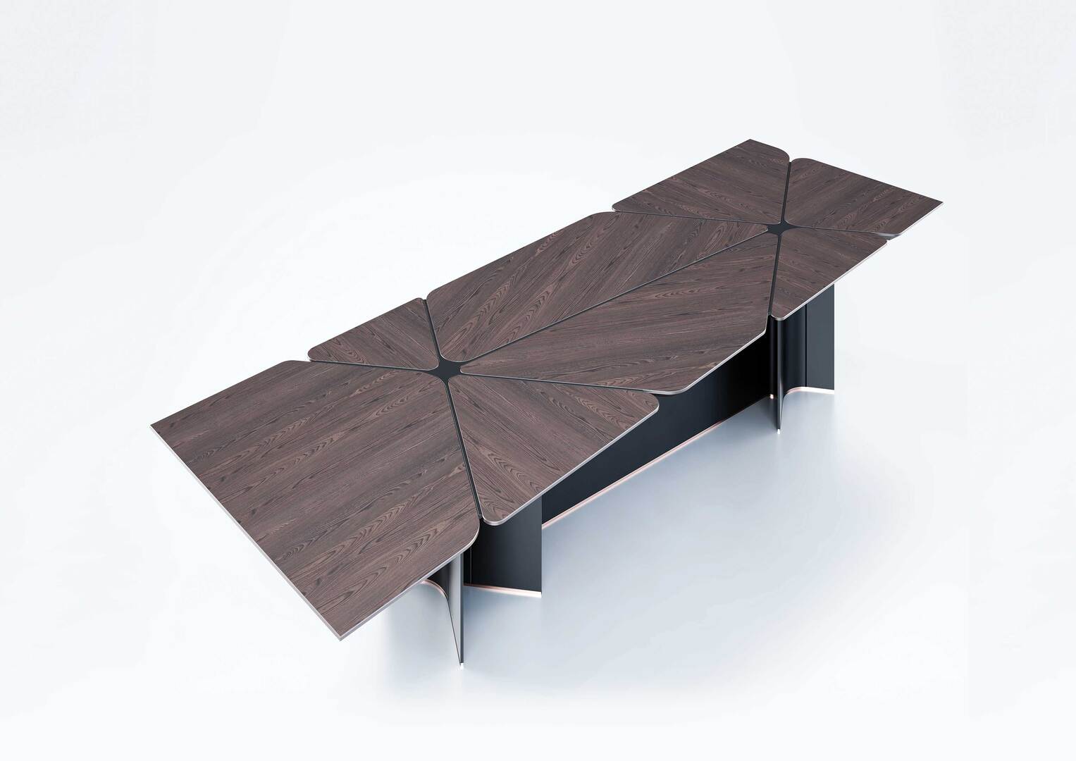 The use of different industrial materials together on the table in a coplanar manner was the inspiration for Patchwork Table. The designer set out to create a table that could be produced in different sizes with the same standard parts and the flexibility of using different materials; all while serving different functions and exhibiting a random pattern without repeating the parts.